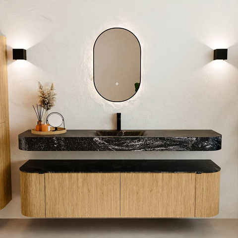 MONDIAZ THOR-DLUX 180cm meuble de salle de bains arrondi gauche + droite couleur Oak avec 2 tiroirs et 2 portes. Vasque suspendue CLOUD Milieu 1 trou de robinet couleur Lava.