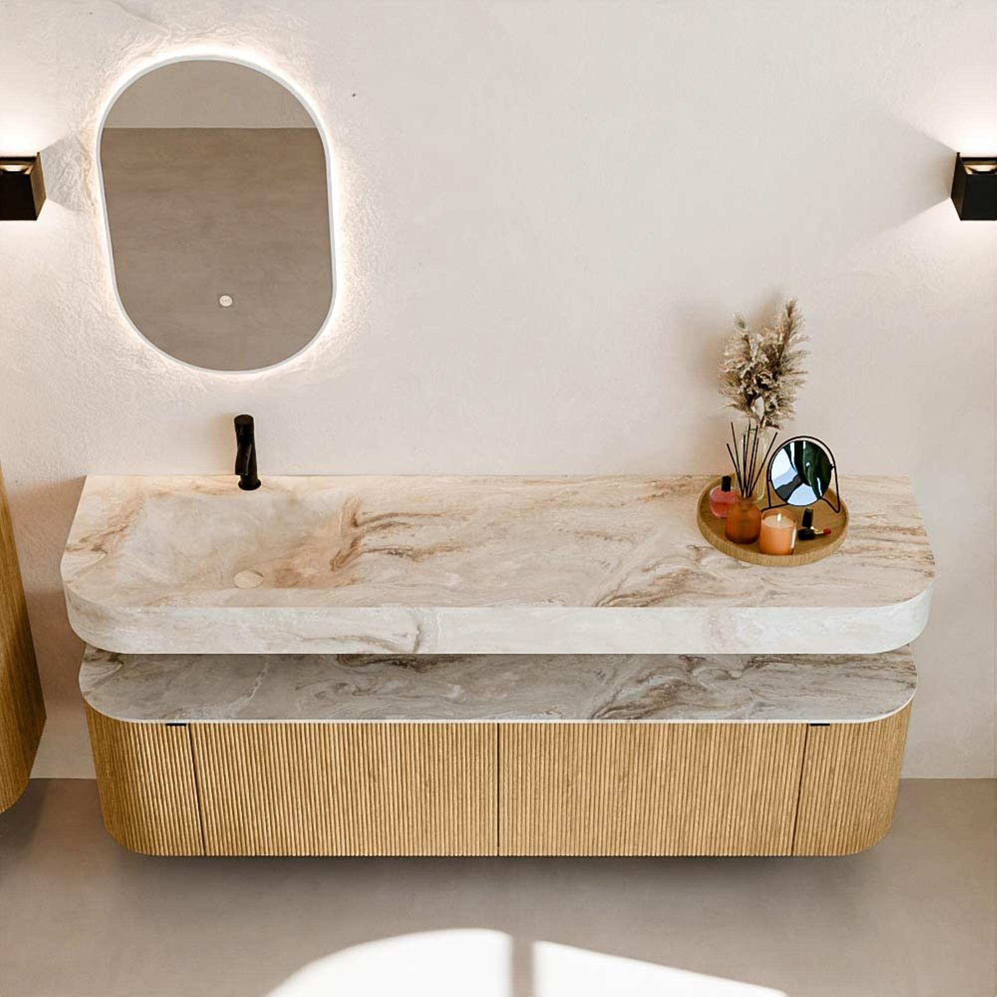 Au-dessus du meuble flotte une vasque suspendue assortie aux coins arrondis – parfaitement adaptée à la forme du meuble. La vasque est réalisée en Solid Surface et suit subtilement les lignes du meuble inférieur, créant ainsi un ensemble harmonieux. Le plan de travail en Solid Surface constitue une base solide et facile d'entretien, complétant la combinaison.