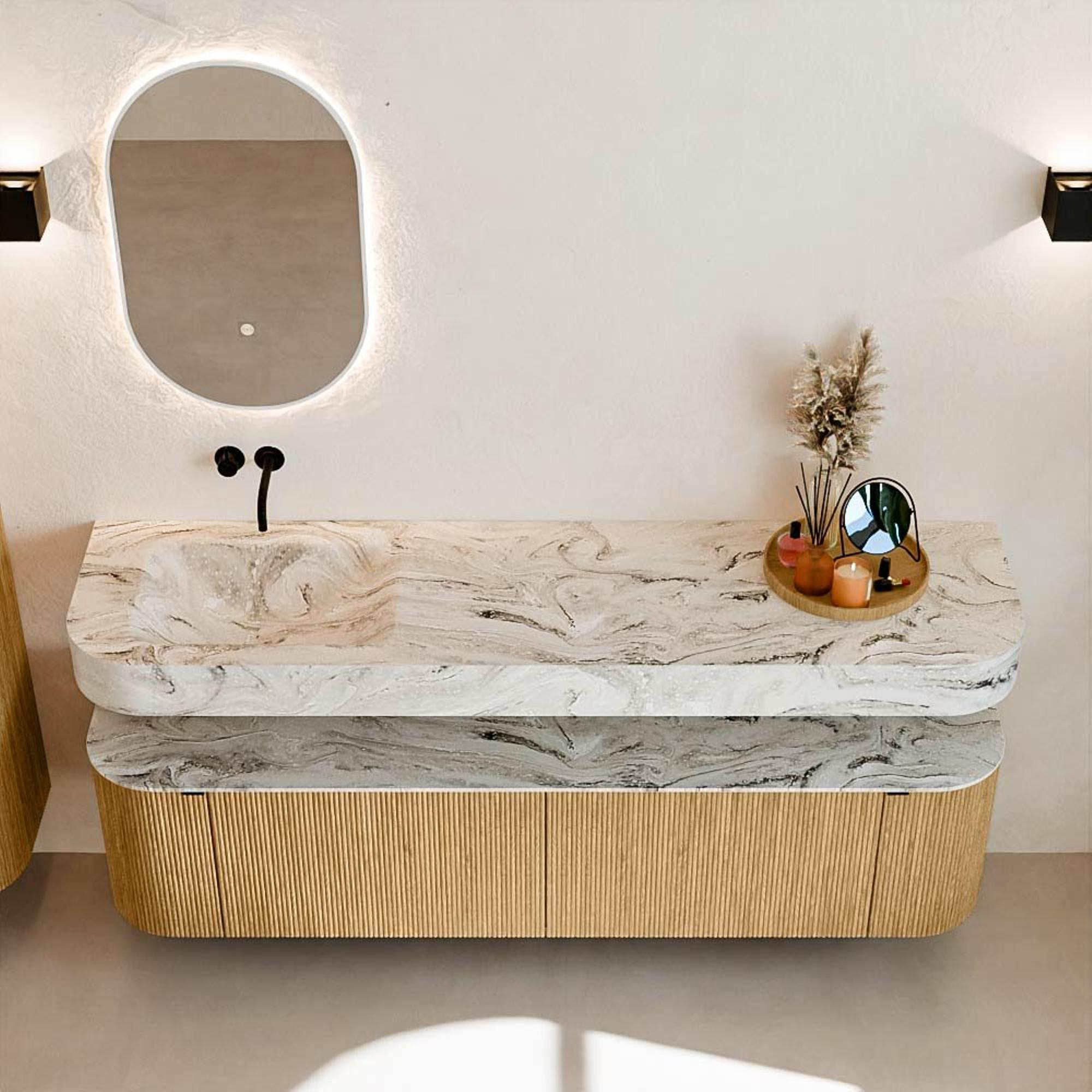 MONDIAZ THOR-DLUX 180cm meuble de salle de bains arrondi gauche + droite couleur Oak avec 2 tiroirs et 2 portes. Vasque suspendue CLOUD Gauche sans trou de robinet couleur Glace.