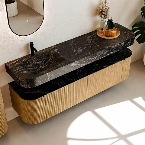 MONDIAZ THOR-DLUX 180cm meuble de salle de bains arrondi gauche + droite couleur Oak avec 2 tiroirs et 2 portes. Vasque suspendue CLOUD Gauche 1 trou de robinet couleur Lava.