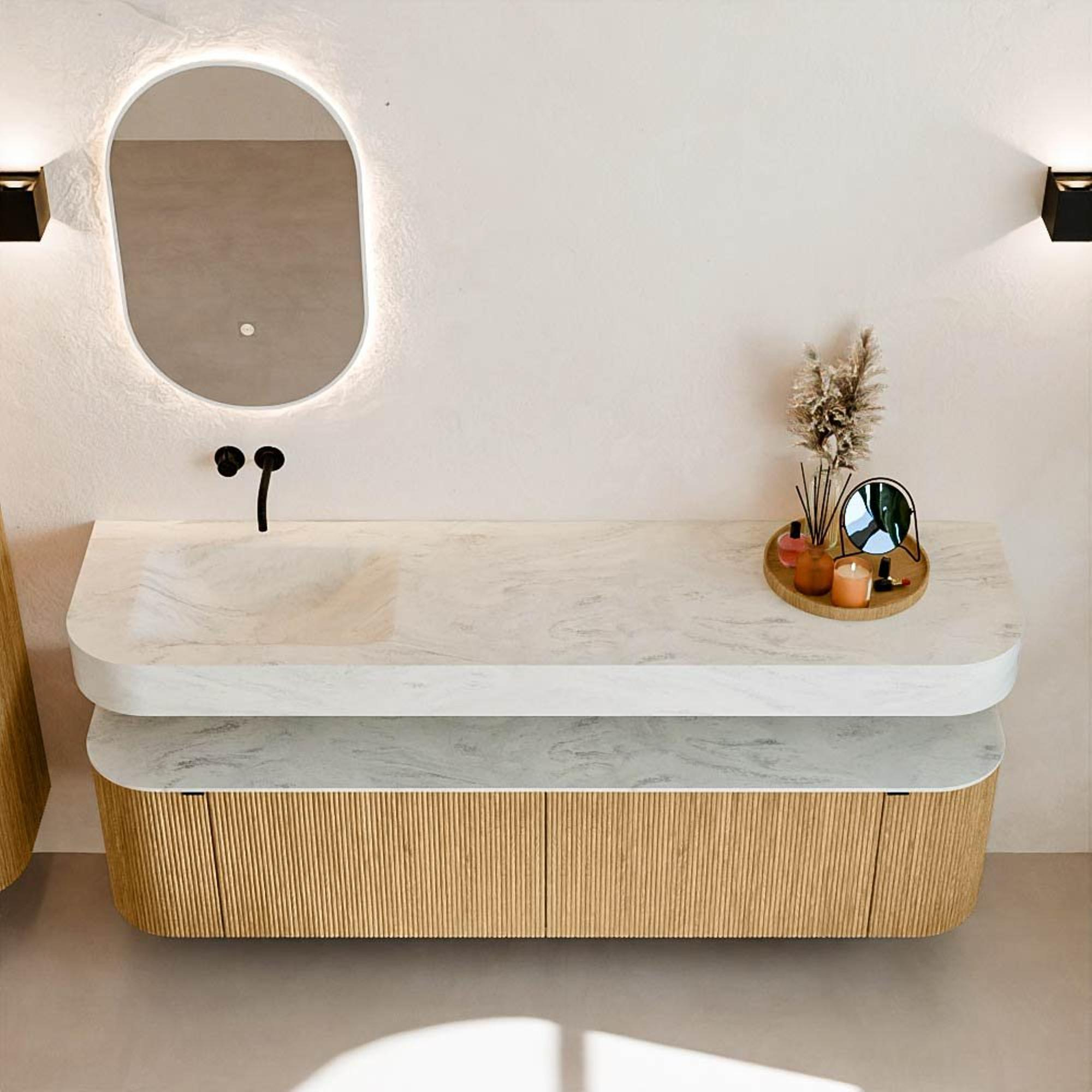 Au-dessus du meuble flotte une vasque suspendue assortie avec des coins arrondis – parfaitement adaptée à la forme du meuble. La vasque est réalisée en Solid Surface et suit subtilement les lignes du meuble inférieur, créant ainsi un ensemble harmonieux. Le plan de travail en Solid Surface forme une base solide, facile d'entretien et complète la combinaison.