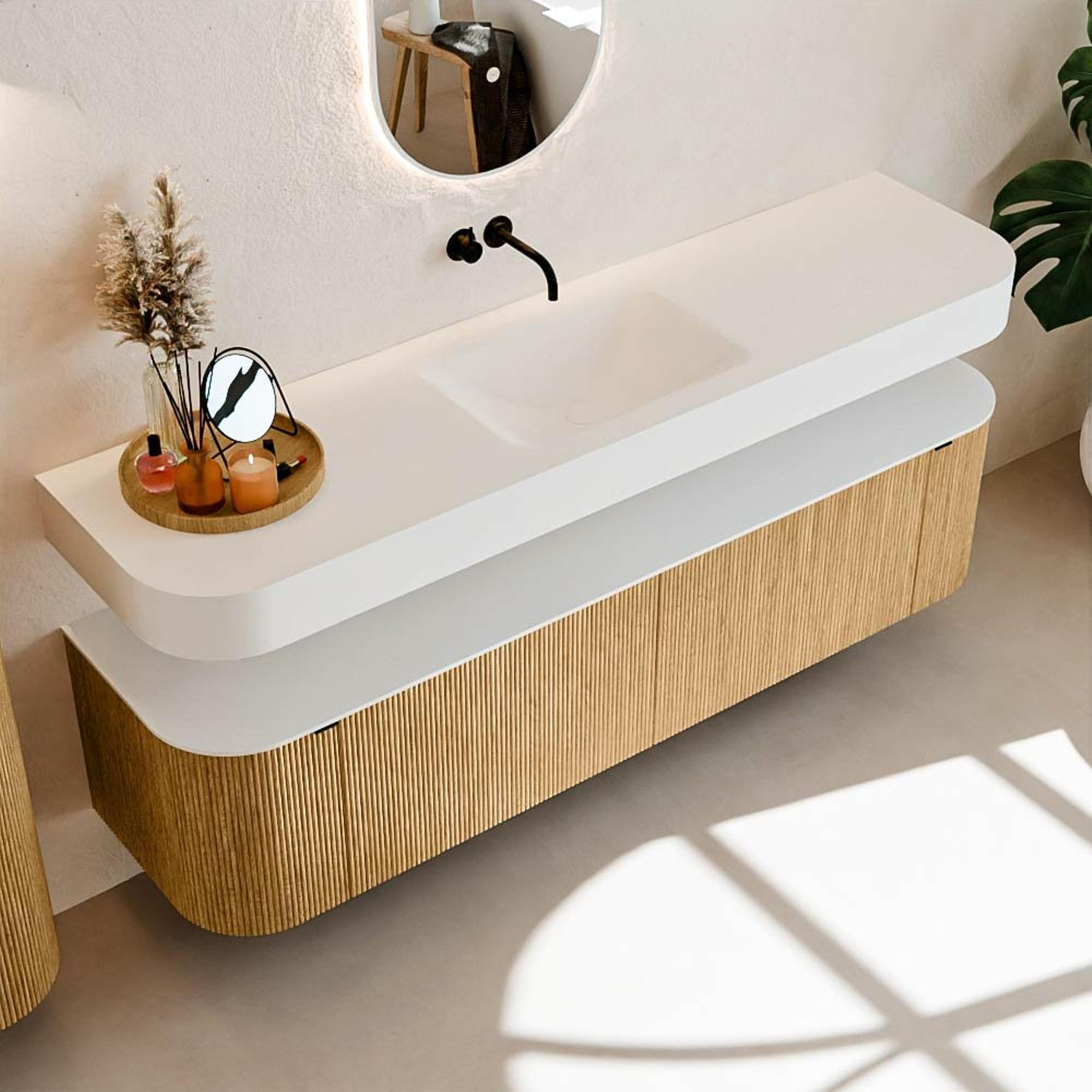 Au-dessus du meuble flotte une vasque suspendue assortie aux coins arrondis – parfaitement adaptée à la forme du meuble. La vasque est en Solid Surface et suit subtilement les lignes du meuble inférieur, créant ainsi un ensemble harmonieux. Le plan de travail en Solid Surface forme une base solide, facile d'entretien et complète la combinaison.