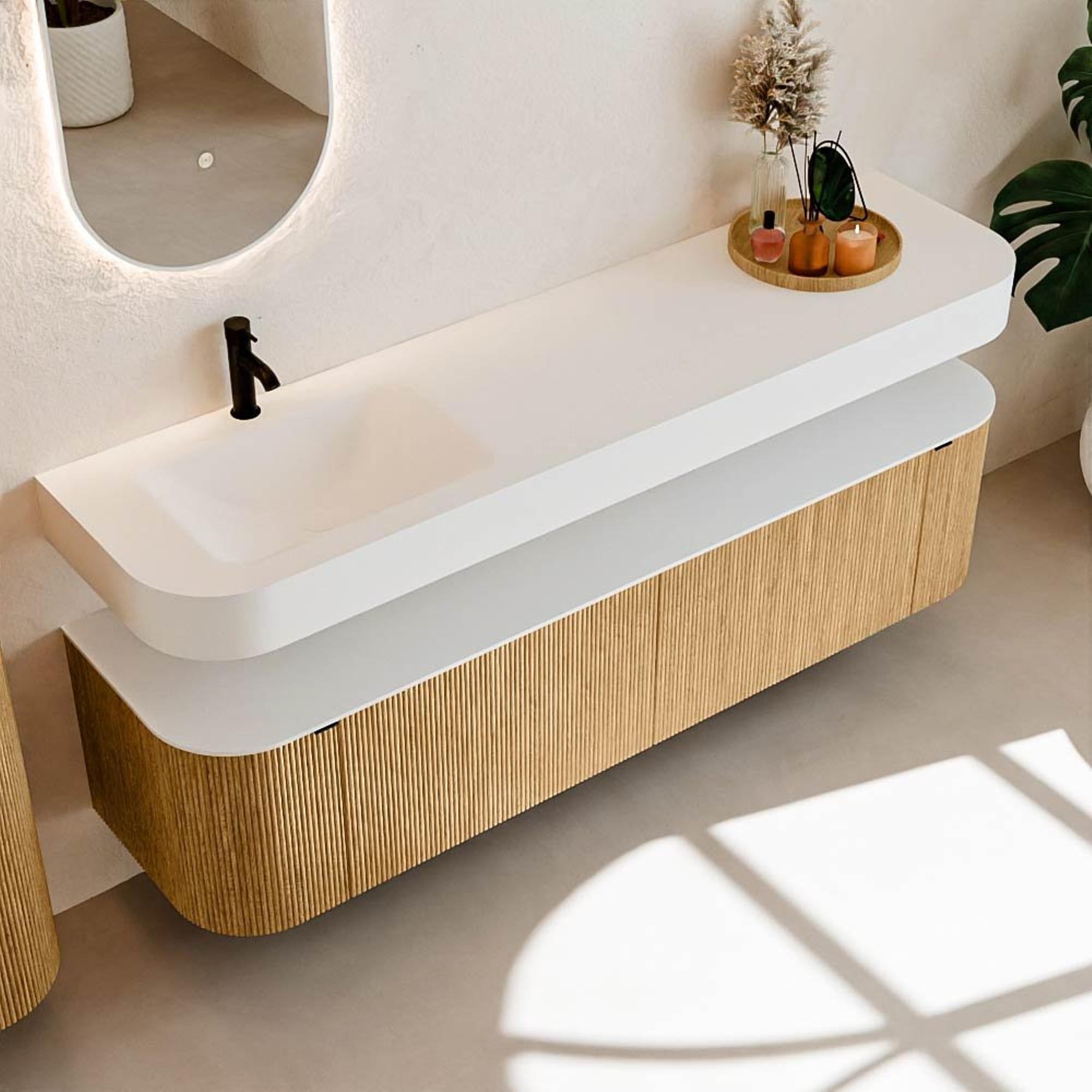 Au-dessus du meuble flotte une vasque suspendue assortie avec des coins arrondis – parfaitement adaptée à la forme du meuble. La vasque est réalisée en Solid Surface et suit subtilement les lignes du meuble inférieur, créant ainsi un ensemble harmonieux. Le plan de travail en Solid Surface forme une base solide et facile d'entretien et complète la combinaison.