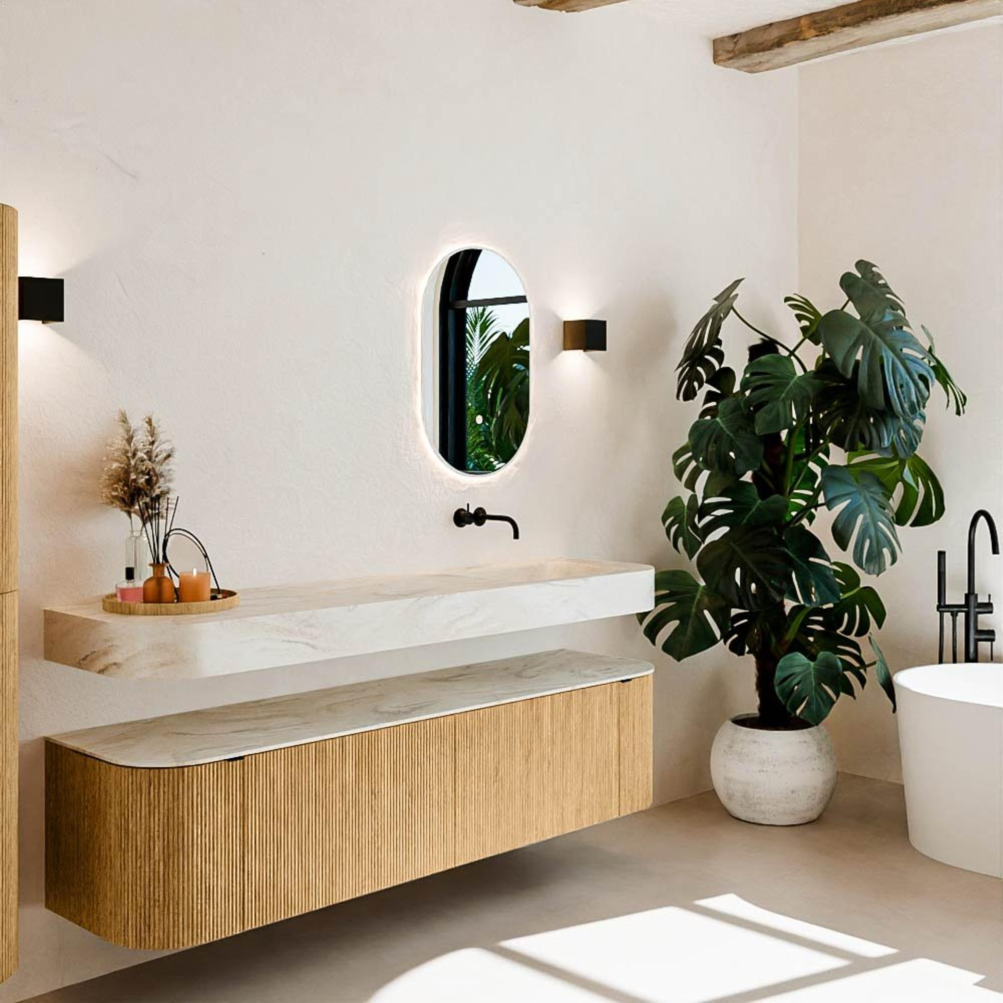 Matériaux naturels dans des tons chauds. Les nervures verticales apportent rythme et texture au design, tandis que le chêne confère une apparence chaleureuse et artisanale. Choisissez parmi 5 teintes de bois OAK, WALNUT, DUSK, SHADOW et RUBY, des couleurs de bois soigneusement sélectionnées pour enrichir les salles de bains modernes et classiques.