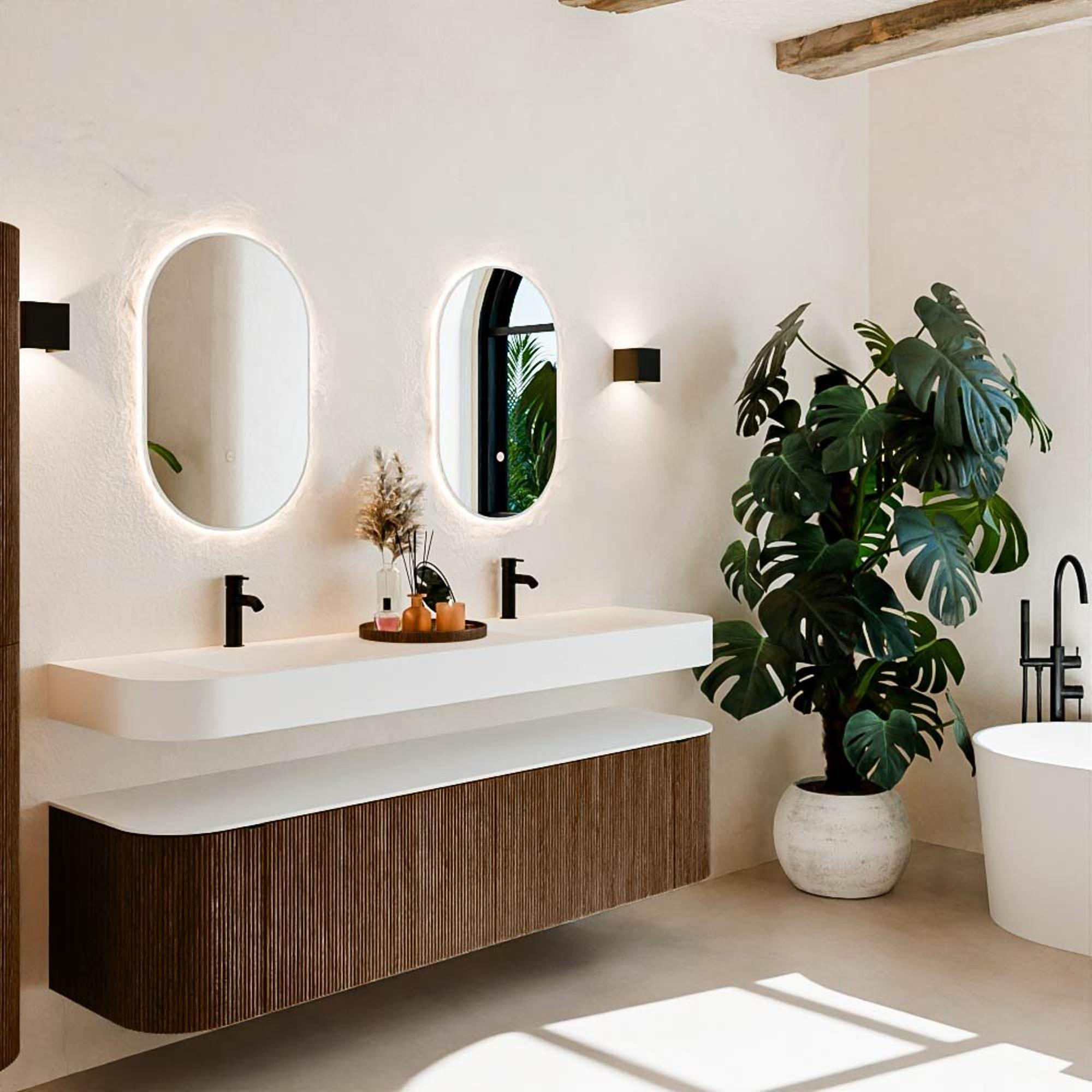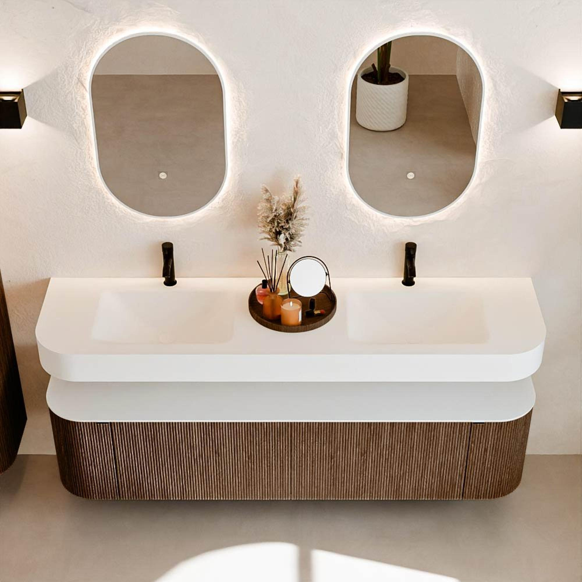 Matériaux naturels dans des tons chauds. Les nervures verticales apportent rythme et texture au design, tandis que le chêne confère une apparence chaleureuse et artisanale. Choisissez parmi 5 teintes de bois OAK, WALNUT, DUSK, SHADOW et RUBY, des couleurs de bois soigneusement sélectionnées pour enrichir les salles de bains modernes et classiques.