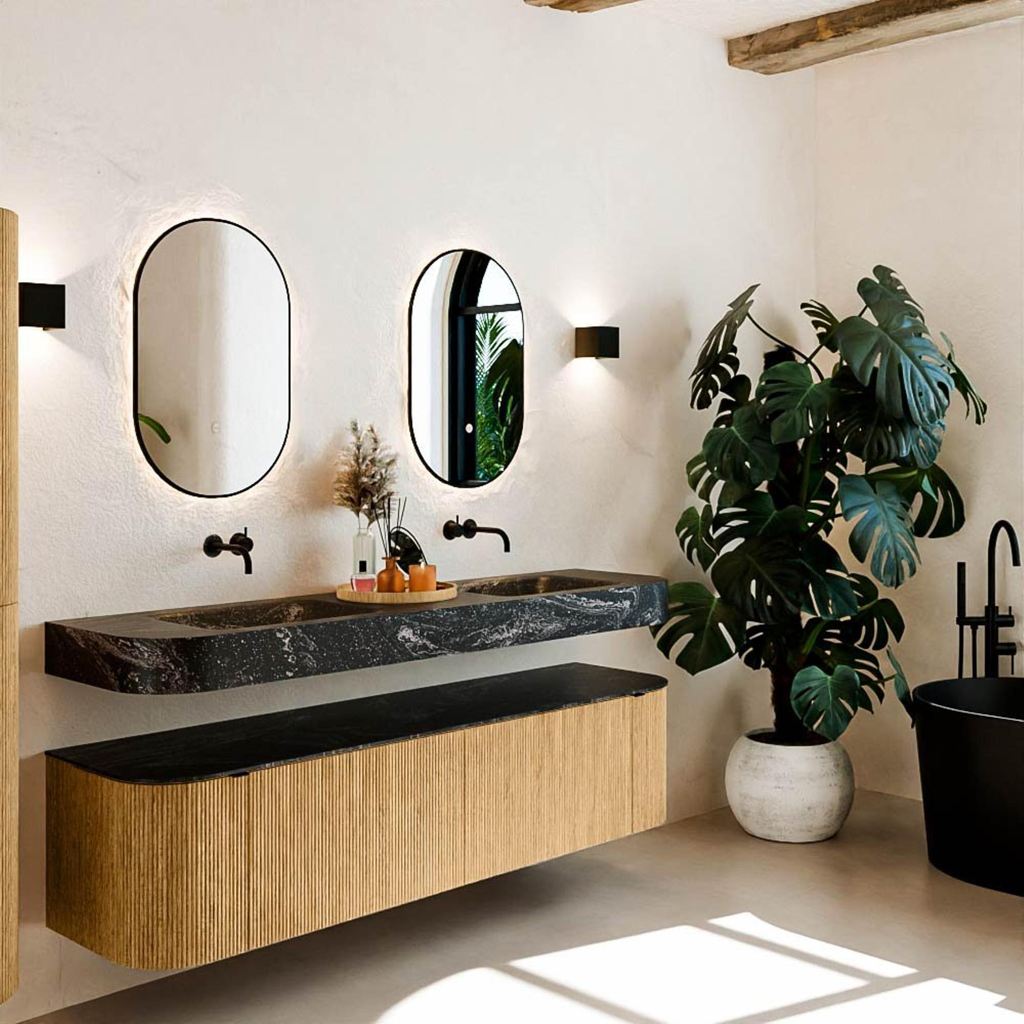 Matériaux naturels dans des tons chauds. Les reliefs verticaux apportent rythme et texture au design, tandis que le chêne confère une apparence chaleureuse et artisanale. Choisissez parmi 5 teintes de bois OAK, WALNUT, DUSK, SHADOW et RUBY, des couleurs de bois soigneusement sélectionnées pour enrichir les salles de bains modernes et classiques.