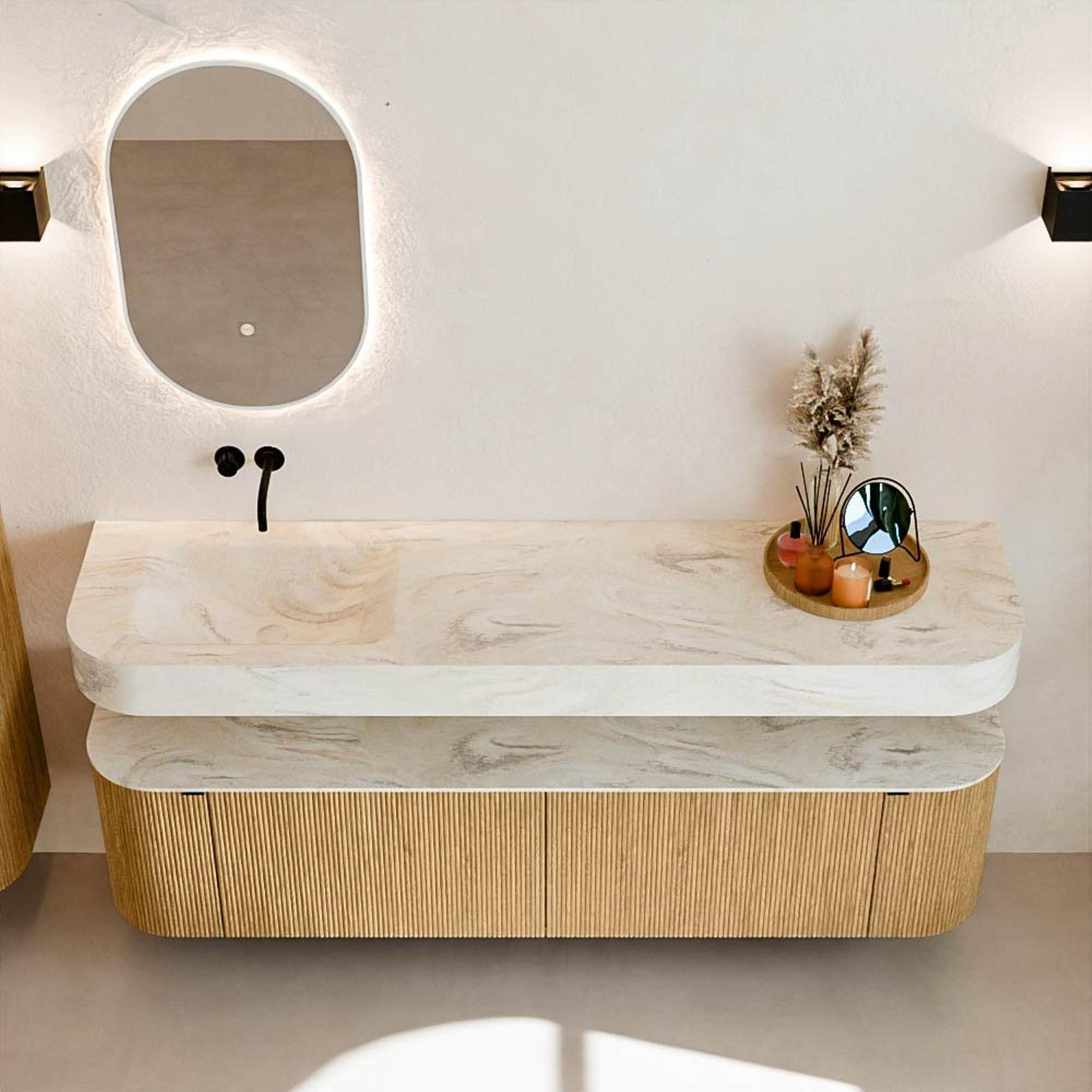 MONDIAZ THOR-DLUX 180cm meuble de salle de bains arrondi gauche + droite couleur Oak avec 2 tiroirs et 2 portes. Vasque suspendue CLOUD Gauche sans trou de robinet couleur Ostra.