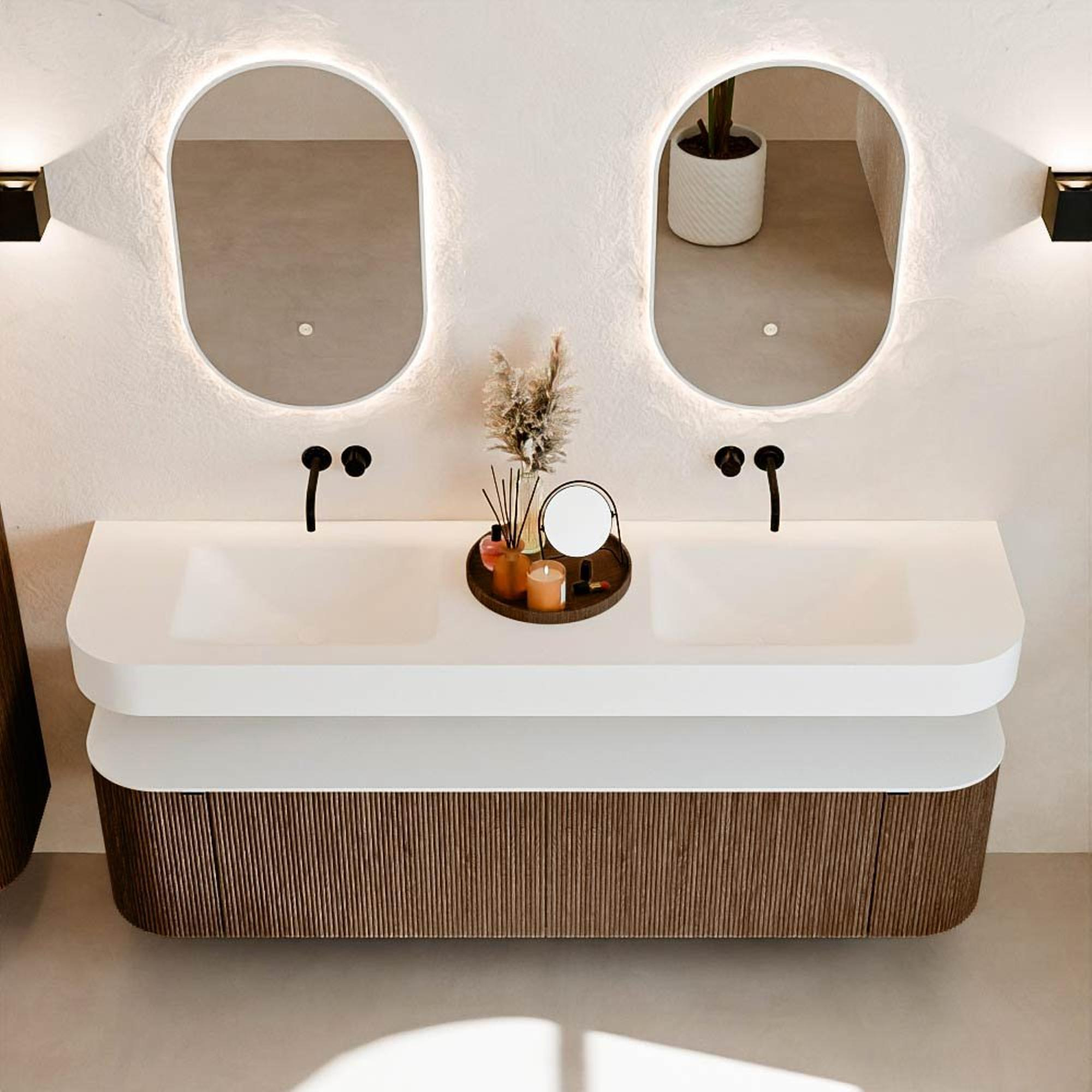 MONDIAZ THOR Meuble de salle de bains 180cm arrondi gauche + droite couleur Walnut avec 2 tiroirs et 2 portes. Vasque suspendue CLOUD Double sans trou de robinet couleur Talc.
