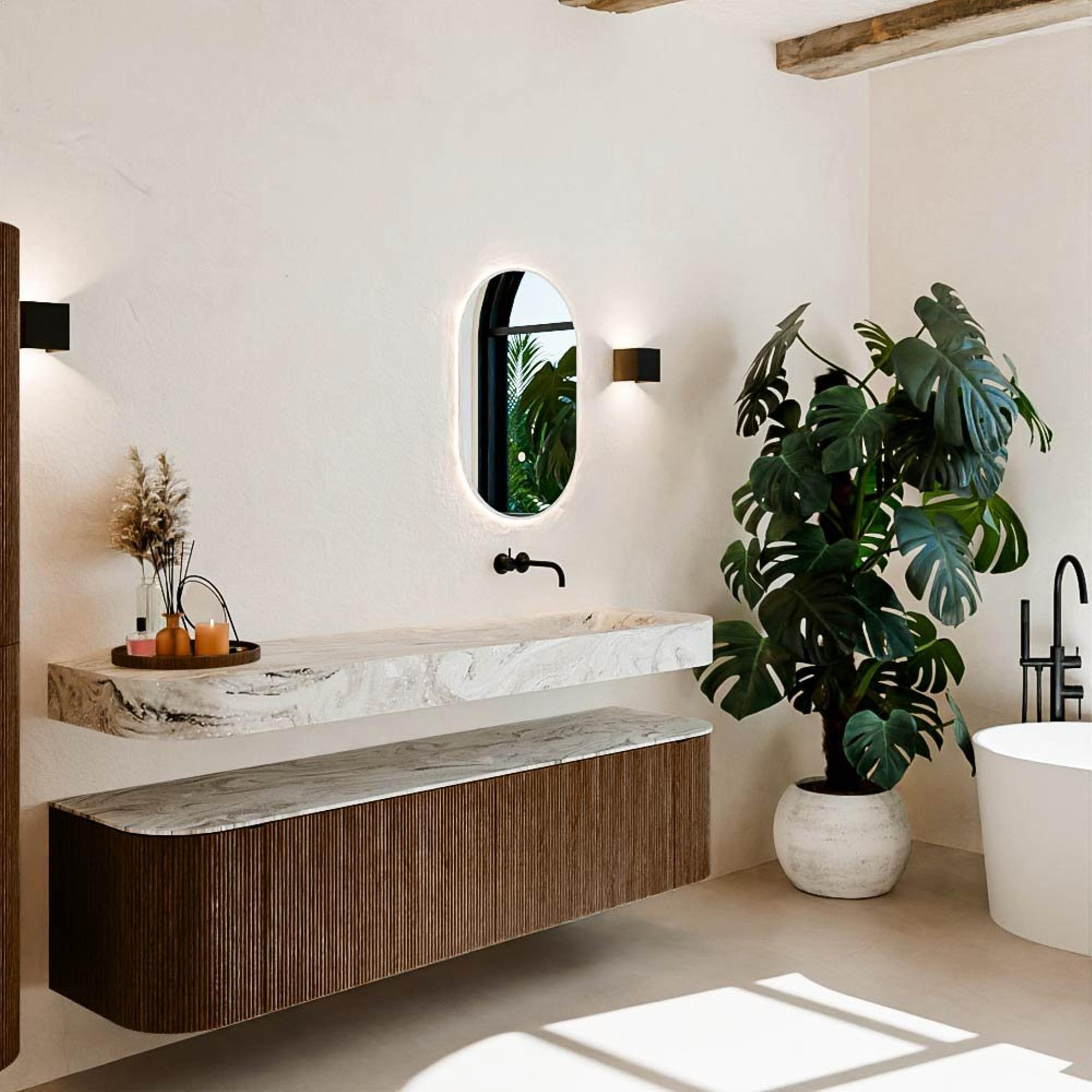 Matériaux naturels dans des tons chauds. Les nervures verticales apportent rythme et texture au design, tandis que le chêne confère une apparence chaleureuse et artisanale. Choisissez parmi 5 teintes de bois OAK, WALNUT, DUSK, SHADOW et RUBY, des couleurs de bois soigneusement sélectionnées pour enrichir les salles de bains modernes et classiques.
