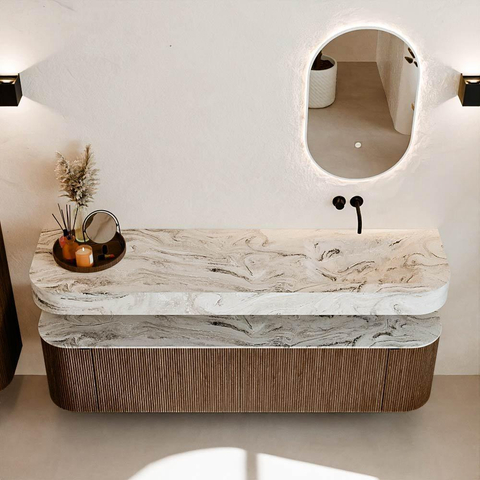 MONDIAZ THOR-DLUX 180cm meuble de salle de bains arrondi gauche + droite couleur Walnut avec 2 tiroirs et 2 portes. Vasque suspendue CLOUD Droite sans trou de robinet couleur Glace.