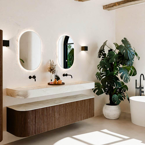Matériaux naturels dans des tons chauds. Les nervures verticales apportent rythme et texture au design, tandis que le chêne confère une apparence chaleureuse et artisanale. Choisissez parmi 5 teintes de bois OAK, WALNUT, DUSK, SHADOW et RUBY, des couleurs de bois soigneusement sélectionnées pour enrichir les salles de bains modernes et classiques.