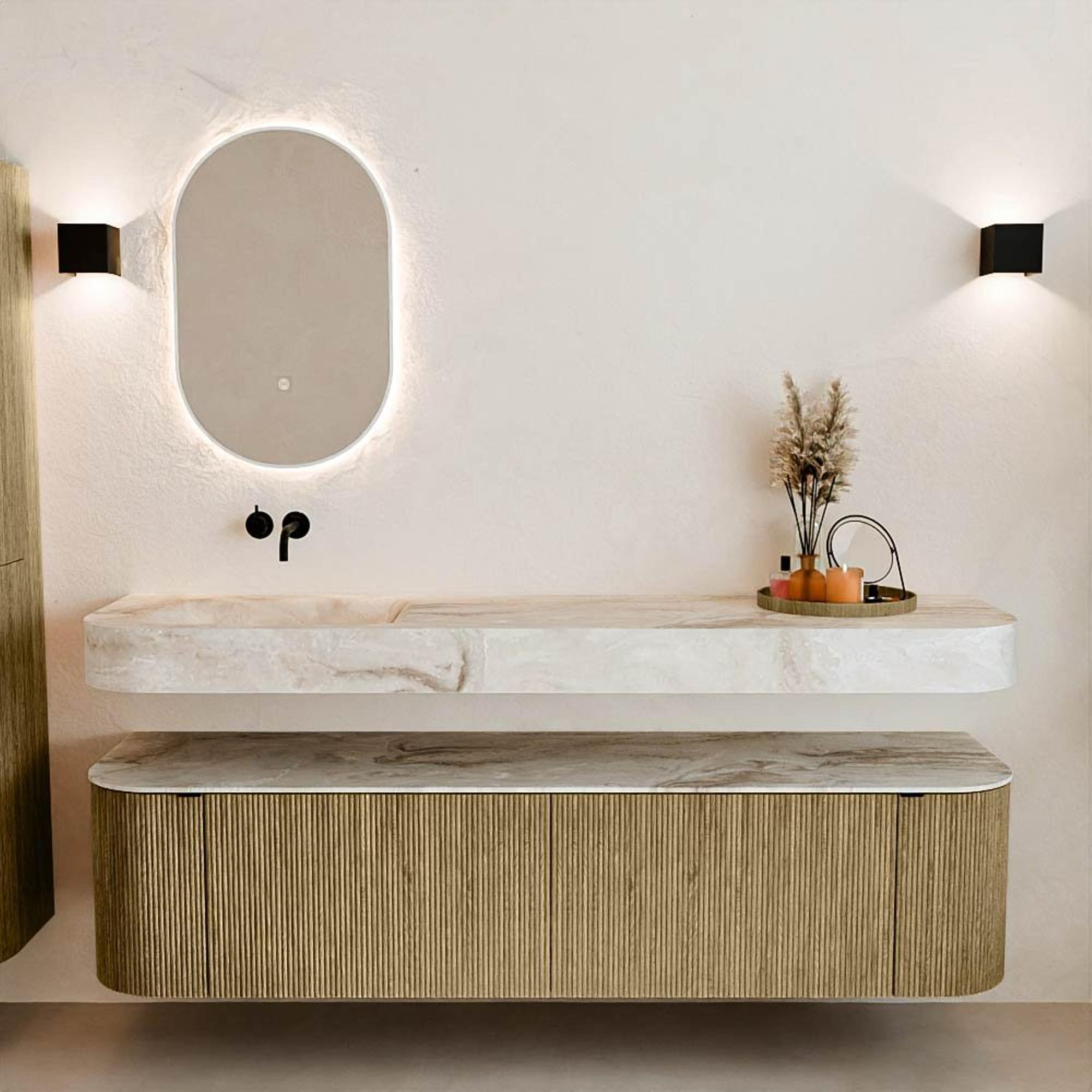 Matériaux naturels dans des tons chauds. Les nervures verticales apportent rythme et texture au design, tandis que le chêne confère une apparence chaleureuse et artisanale. Choisissez parmi 5 teintes de bois OAK, WALNUT, DUSK, SHADOW et RUBY, des couleurs de bois soigneusement sélectionnées pour enrichir les salles de bains modernes et classiques.