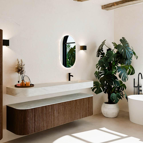 Matériaux naturels dans des tons chauds. Les cannelures verticales apportent rythme et texture au design, tandis que le chêne confère une apparence chaleureuse et artisanale. Choisissez parmi 5 teintes de bois OAK, WALNUT, DUSK, SHADOW et RUBY, des couleurs de bois soigneusement sélectionnées pour enrichir les salles de bains modernes et classiques.