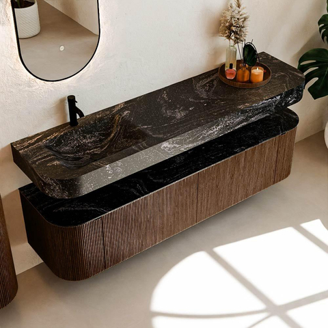 Matériaux naturels dans des tons chauds. Les nervures verticales apportent rythme et texture au design, tandis que le chêne confère une apparence chaleureuse et artisanale. Choisissez parmi 5 teintes de bois OAK, WALNUT, DUSK, SHADOW et RUBY, des couleurs de bois soigneusement sélectionnées pour enrichir les salles de bains modernes et classiques.
