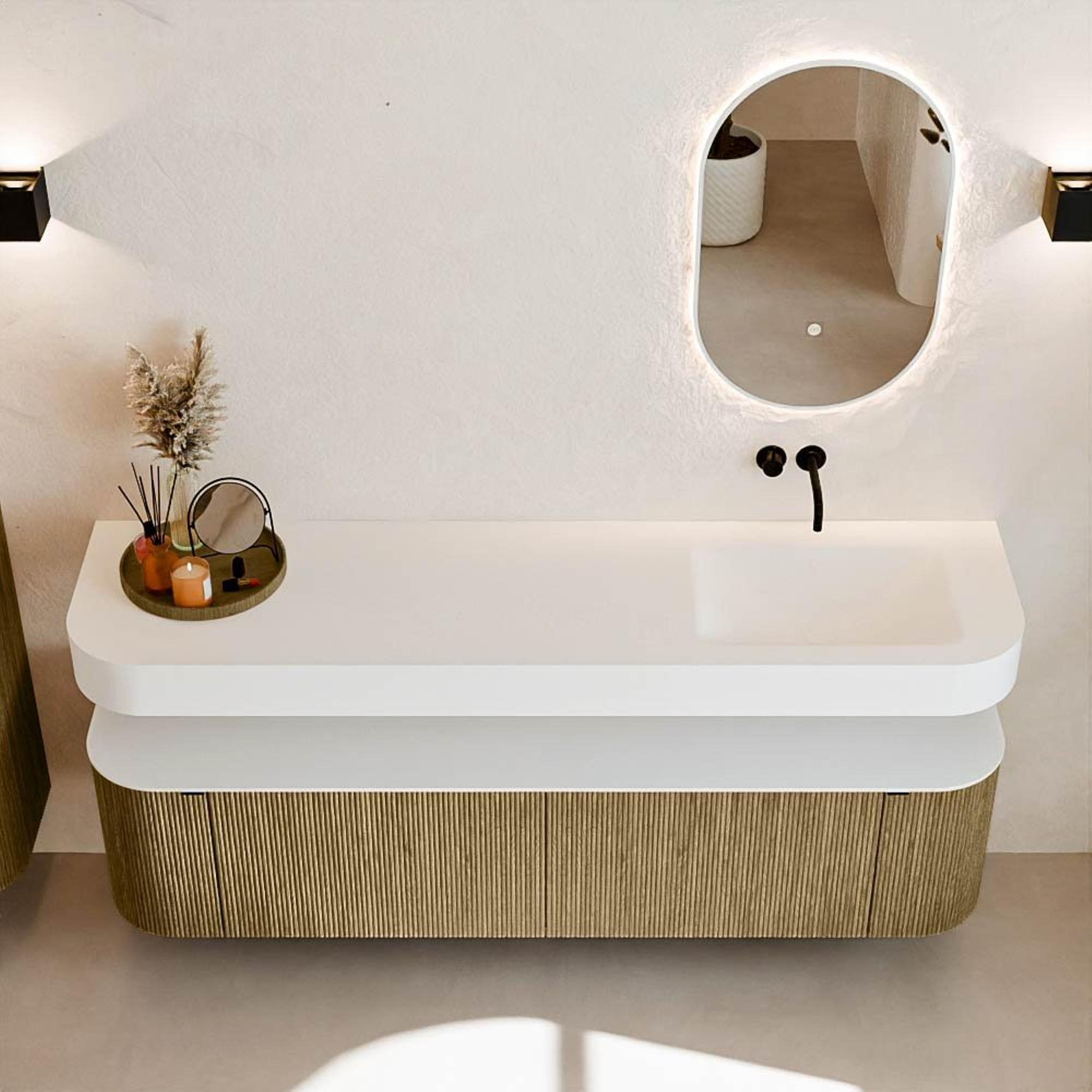 Au-dessus du meuble flotte une vasque suspendue assortie aux coins arrondis – parfaitement adaptée à la forme du meuble. La vasque est réalisée en Solid Surface et suit subtilement les lignes du meuble inférieur, créant une harmonie parfaite. Le plan de travail en Solid Surface forme une base solide et facile d'entretien, complétant l'ensemble.