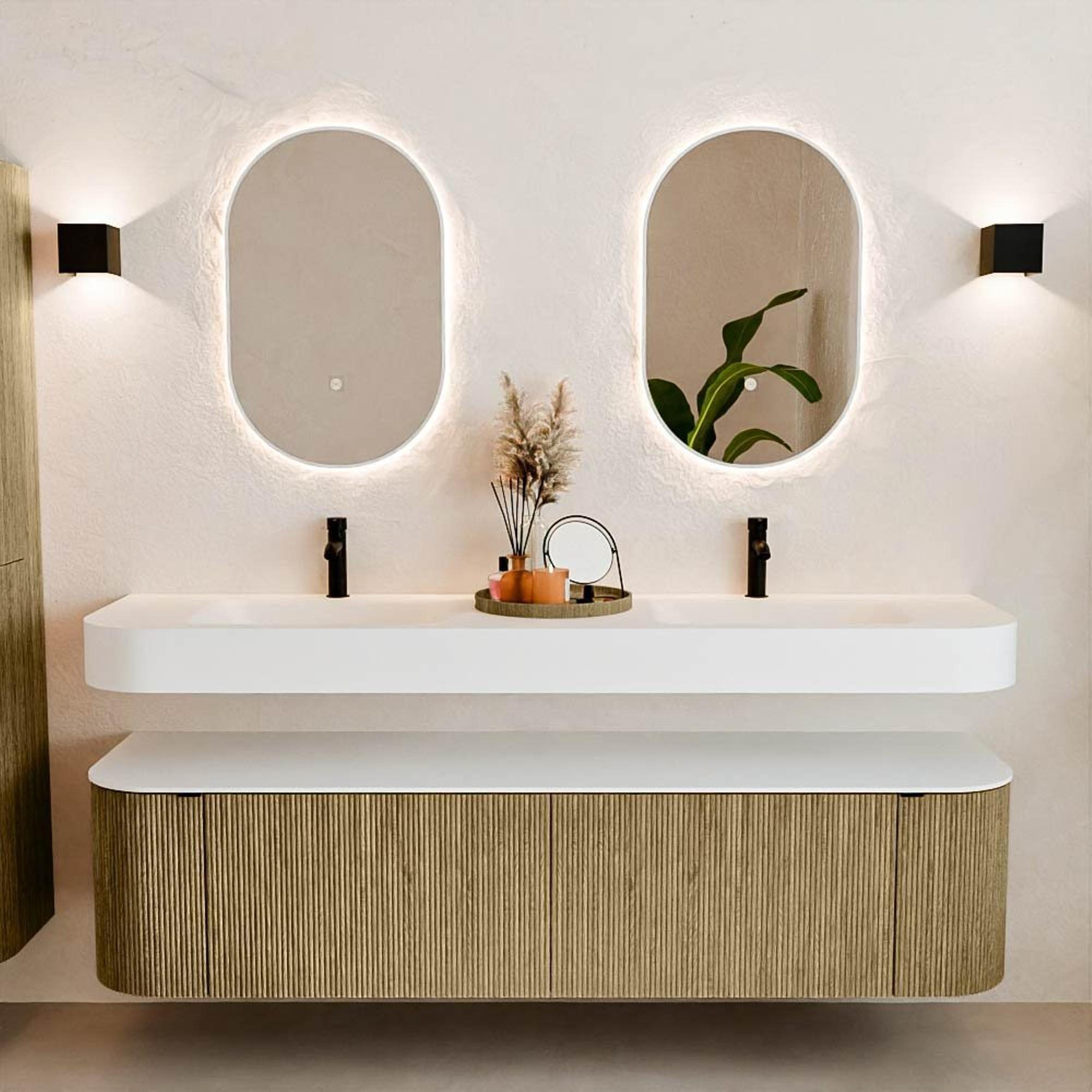 Matériaux naturels dans des tons chauds. Les nervures verticales apportent rythme et texture au design, tandis que le chêne confère une apparence chaleureuse et artisanale. Choisissez parmi 5 teintes de bois OAK, WALNUT, DUSK, SHADOW et RUBY, des couleurs de bois soigneusement sélectionnées pour enrichir les salles de bains modernes et classiques.