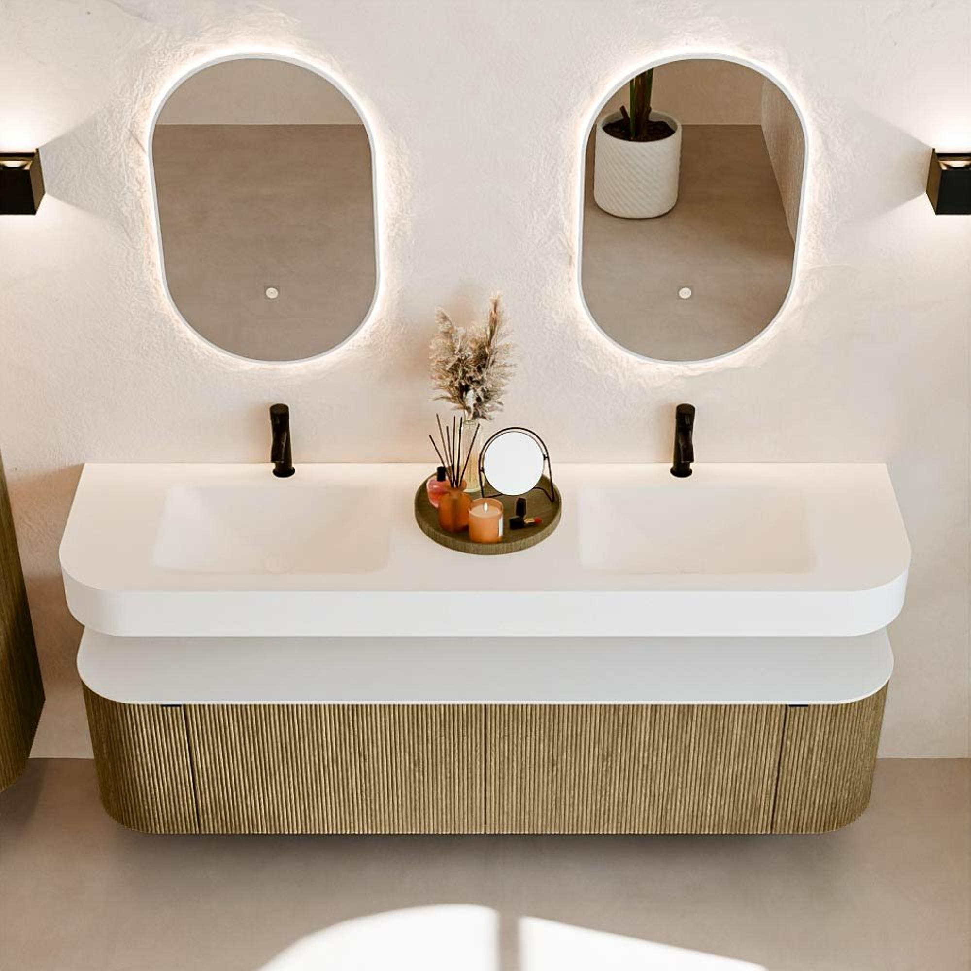 Au-dessus du meuble flotte une vasque suspendue assortie aux coins arrondis – parfaitement adaptée à la forme du meuble. La vasque est réalisée en Solid Surface et suit subtilement les lignes du meuble inférieur, créant un ensemble harmonieux. Le plan de travail en Solid Surface forme une base solide et facile d'entretien et complète la combinaison.