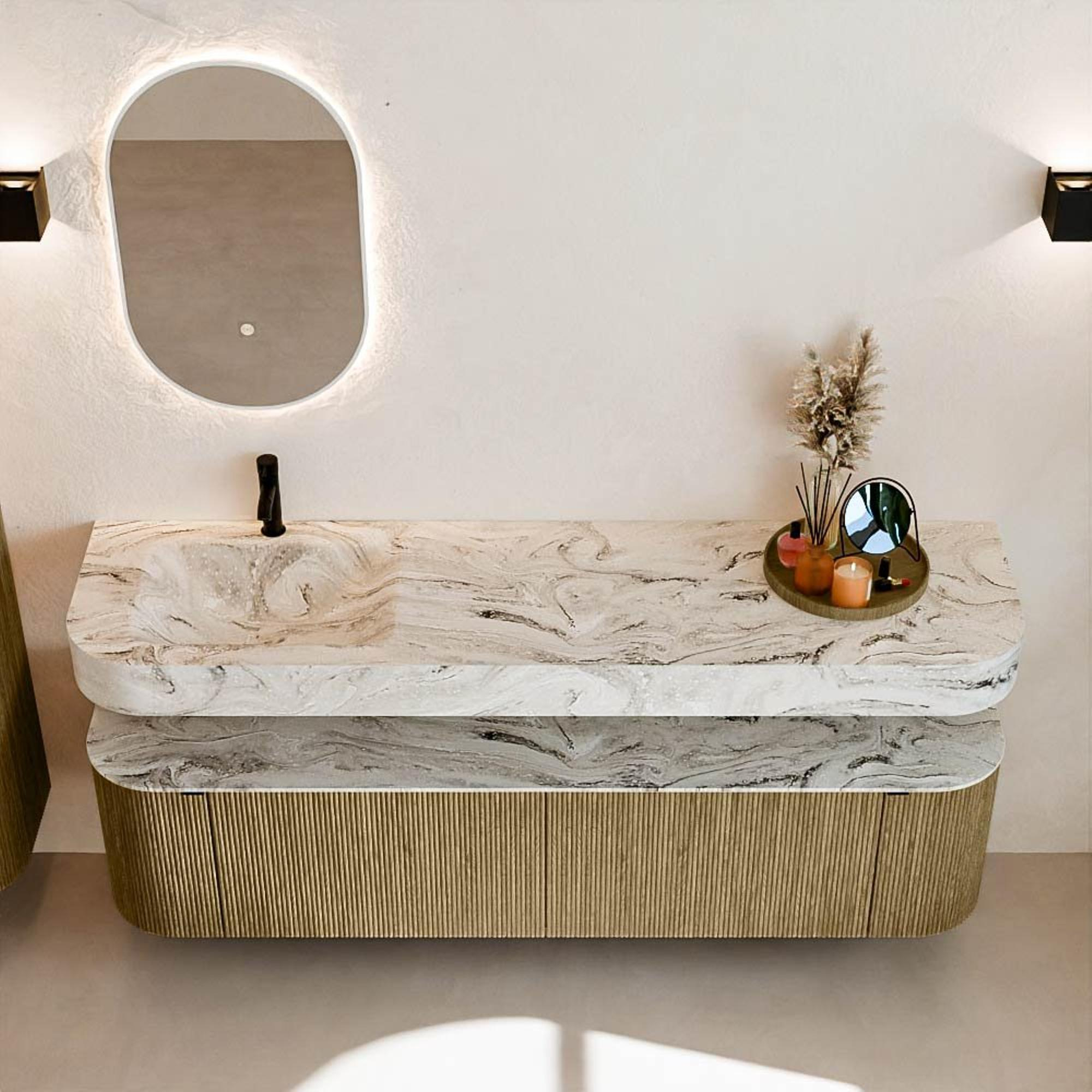 Matériaux naturels dans des tons chauds. Les nervures verticales apportent rythme et texture au design, tandis que le chêne confère une apparence chaleureuse et artisanale. Choisissez parmi 5 teintes de bois OAK, WALNUT, DUSK, SHADOW et RUBY, des couleurs de bois soigneusement sélectionnées pour enrichir les salles de bains modernes et classiques.
