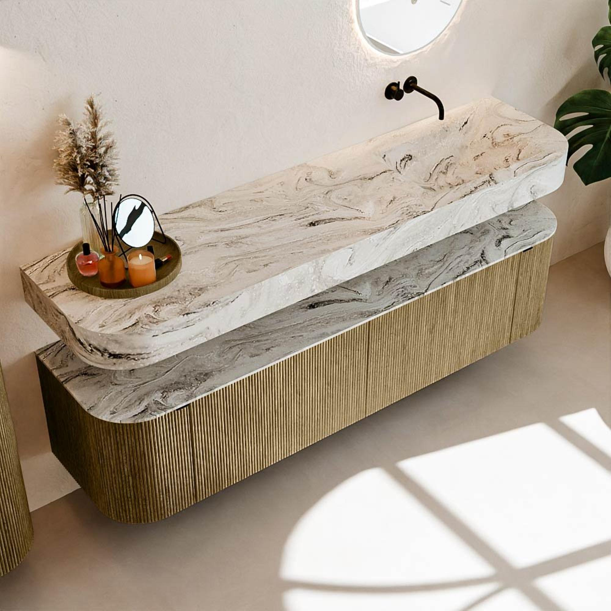 Au-dessus du meuble flotte une vasque suspendue assortie aux coins arrondis – parfaitement adaptée à la forme du meuble. La vasque est en Solid Surface et suit subtilement les lignes du meuble inférieur, créant une harmonie parfaite. Le plan de travail en Solid Surface forme une base solide et facile d’entretien, complétant l’ensemble.