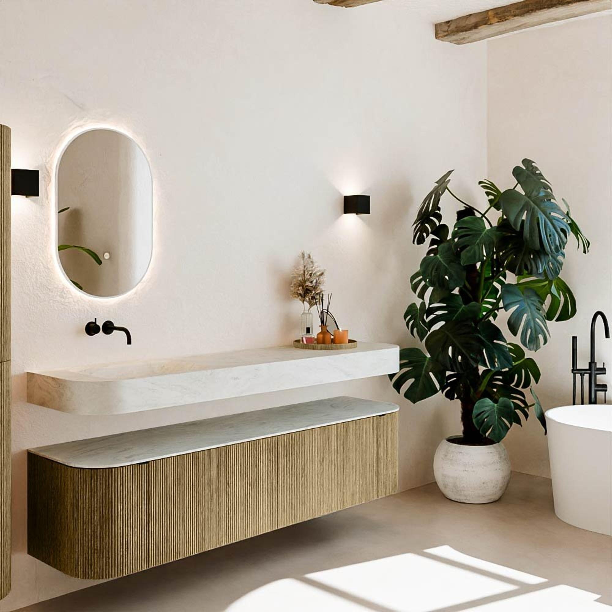 Matériaux naturels dans des tons chauds. Les nervures verticales apportent rythme et texture au design, tandis que le chêne confère une apparence chaleureuse et artisanale. Choisissez parmi 5 teintes de bois OAK, WALNUT, DUSK, SHADOW et RUBY, des couleurs de bois soigneusement sélectionnées pour enrichir les salles de bains modernes et classiques.