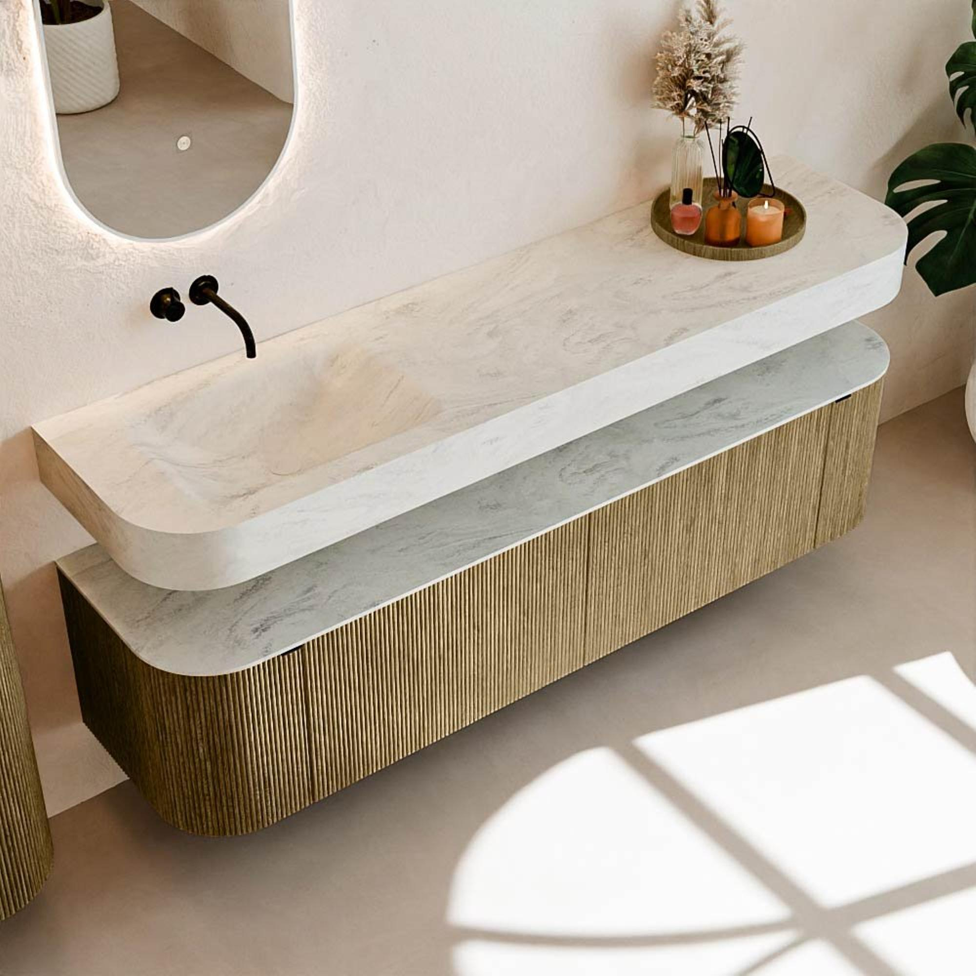 Au-dessus du meuble flotte une vasque suspendue assortie avec des coins arrondis – parfaitement adaptée à la forme du meuble. La vasque est réalisée en Solid Surface et suit subtilement les lignes du meuble inférieur, créant ainsi un ensemble harmonieux. Le plan de travail en Solid Surface forme une base solide, facile d'entretien, et complète la combinaison.