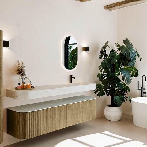 Matériaux naturels dans des tons chauds. Les nervures verticales apportent rythme et texture au design, tandis que le chêne confère une apparence chaleureuse et artisanale. Choisissez parmi 5 teintes de bois OAK, WALNUT, DUSK, SHADOW et RUBY, des couleurs de bois soigneusement sélectionnées pour enrichir les salles de bains modernes et classiques.