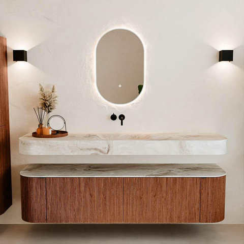 Matériaux naturels dans des tons chauds. Les nervures verticales apportent rythme et texture au design, tandis que le chêne confère une apparence chaleureuse et artisanale. Choisissez parmi 5 teintes de bois OAK, WALNUT, DUSK, SHADOW et RUBY, des couleurs de bois soigneusement sélectionnées pour enrichir les salles de bains modernes et classiques.