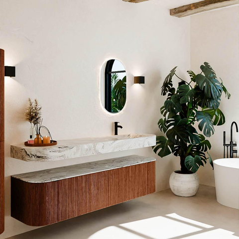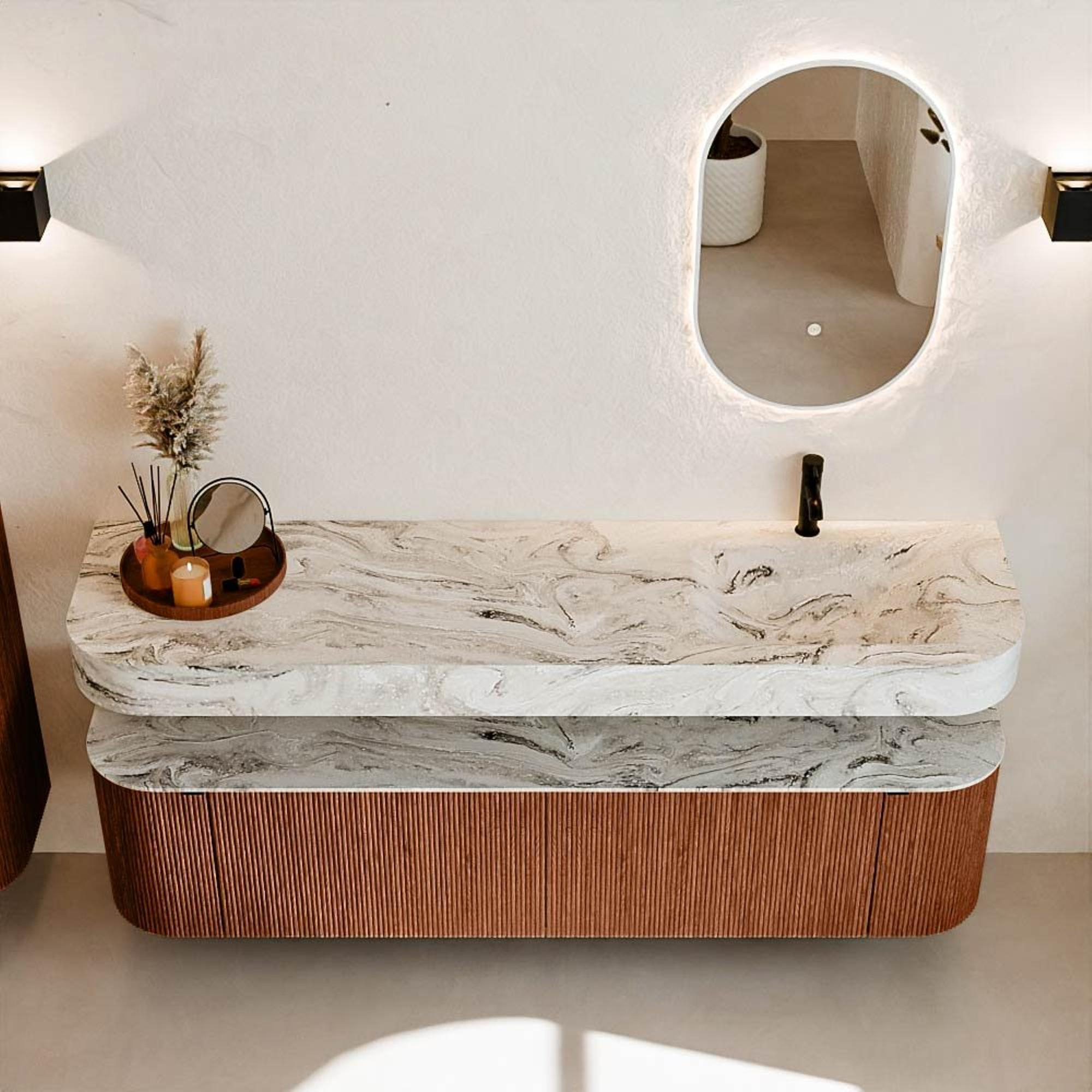 Au-dessus du meuble flotte une vasque suspendue assortie aux coins arrondis – parfaitement adaptée à la forme du meuble. La vasque est réalisée en Solid Surface et suit subtilement les lignes du meuble inférieur, créant ainsi un ensemble harmonieux. Le plan de travail en Solid Surface forme une base solide, facile d'entretien, et complète la combinaison.