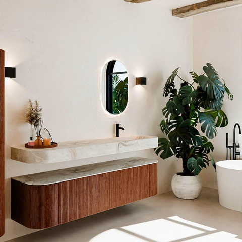 Au-dessus du meuble flotte une vasque suspendue assortie aux angles arrondis – parfaitement adaptée à la forme du meuble. La vasque est en Solid Surface et suit subtilement les lignes du meuble inférieur, créant un ensemble harmonieux. Le plan de travail en Solid Surface forme une base solide, facile d'entretien et complète la combinaison.