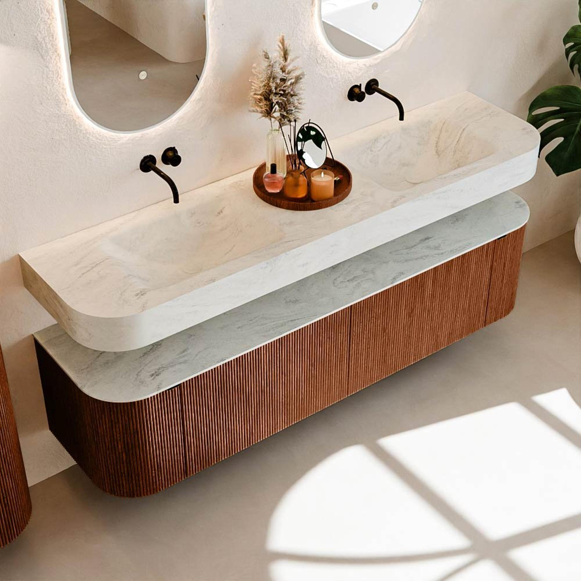 Matériaux naturels dans des tons chauds. Les nervures verticales apportent rythme et texture au design, tandis que le chêne confère une apparence chaleureuse et artisanale. Choisissez parmi 5 teintes de bois OAK, WALNUT, DUSK, SHADOW et RUBY, des couleurs de bois soigneusement sélectionnées pour enrichir les salles de bains modernes et classiques.