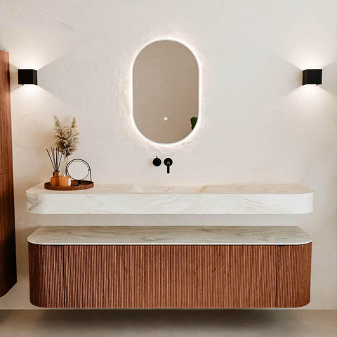 Matériaux naturels dans des tons chauds. Les rainures verticales apportent rythme et texture au design, tandis que le chêne confère une apparence chaleureuse et artisanale. Choisissez parmi 5 teintes de bois OAK, WALNUT, DUSK, SHADOW et RUBY, des couleurs de bois soigneusement sélectionnées pour enrichir les salles de bains modernes et classiques.
