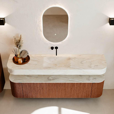 Au-dessus du meuble flotte une vasque suspendue assortie aux coins arrondis – parfaitement adaptée à la forme du meuble. La vasque est réalisée en Solid Surface et suit subtilement les lignes du meuble sous-jacent, créant ainsi un ensemble harmonieux. Le plan de travail en Solid Surface constitue une base solide et facile d'entretien et complète la combinaison.