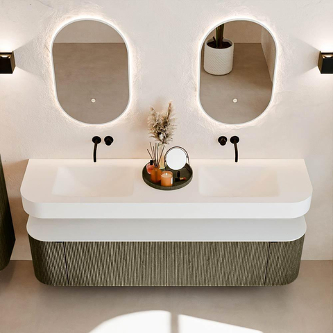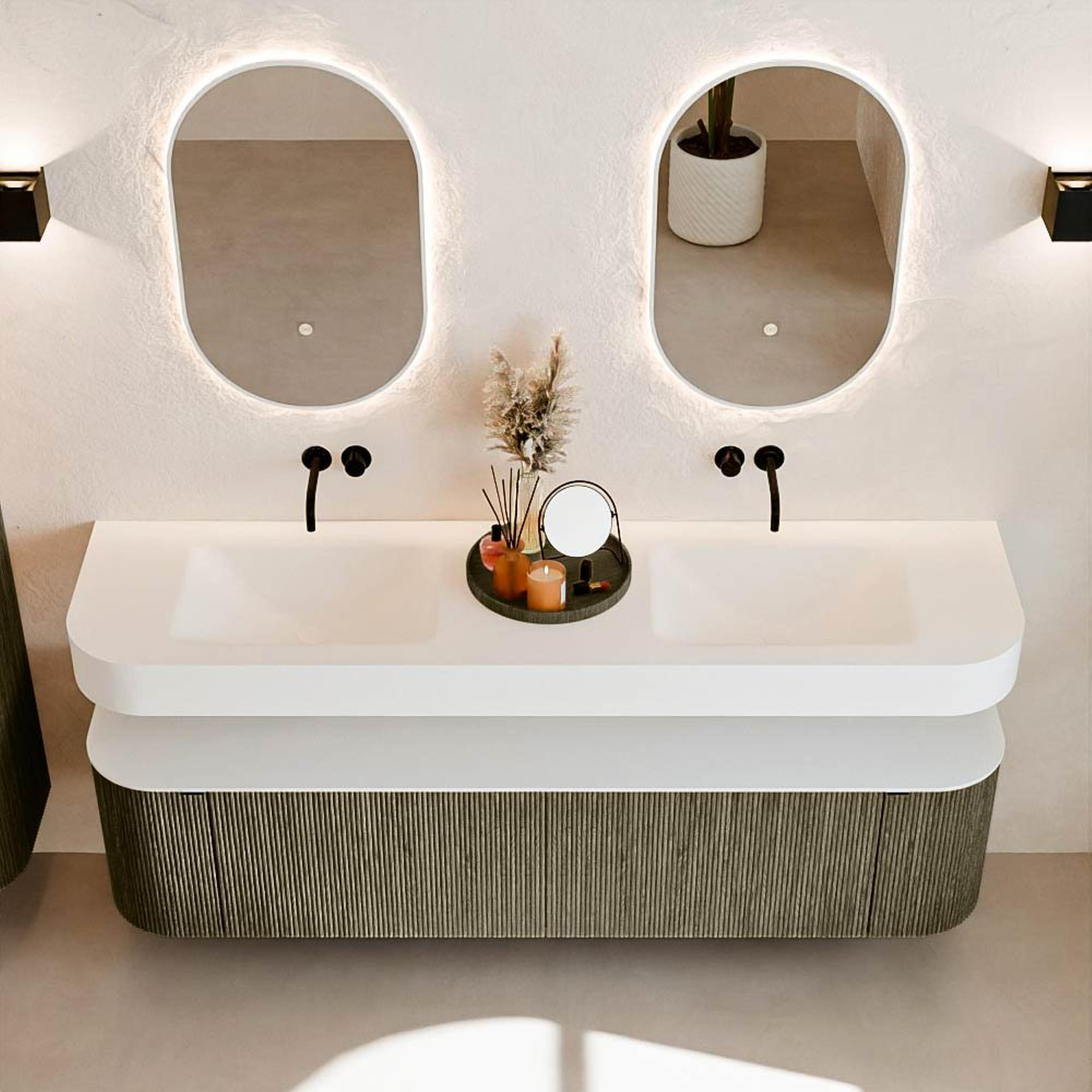 Au-dessus du meuble flotte une vasque suspendue assortie aux coins arrondis – parfaitement adaptée à la forme du meuble. La vasque est réalisée en Solid Surface et suit subtilement les lignes du meuble sous-jacent, créant un ensemble harmonieux. Le plan de travail en Solid Surface constitue une base solide et facile d'entretien qui complète la combinaison.