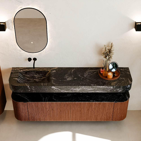MONDIAZ THOR-DLUX 180cm meuble de salle de bains arrondi gauche + droite couleur Ruby avec 2 tiroirs et 2 portes. Vasque suspendue CLOUD Gauche sans trou de robinet couleur Lava.