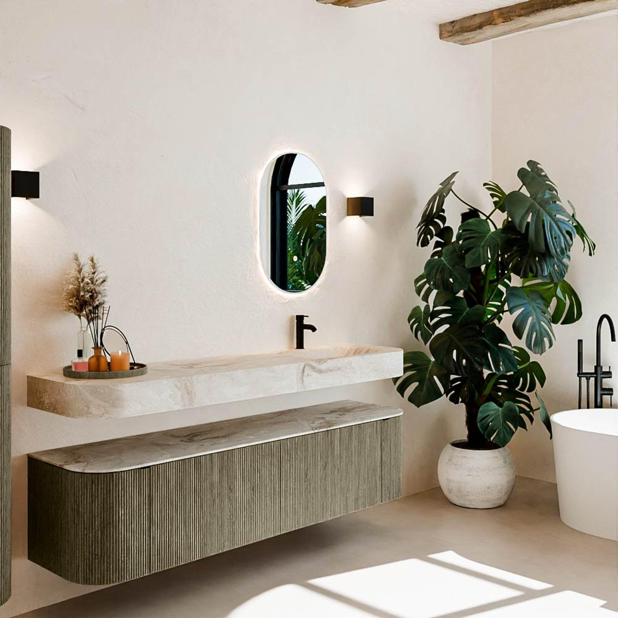 Matériaux naturels aux teintes chaudes. Les cannelures verticales apportent rythme et texture au design, tandis que le chêne confère une apparence chaleureuse et artisanale. Choisissez parmi 5 teintes de bois OAK, WALNUT, DUSK, SHADOW et RUBY, des couleurs de bois soigneusement sélectionnées pour enrichir les salles de bains modernes et classiques.