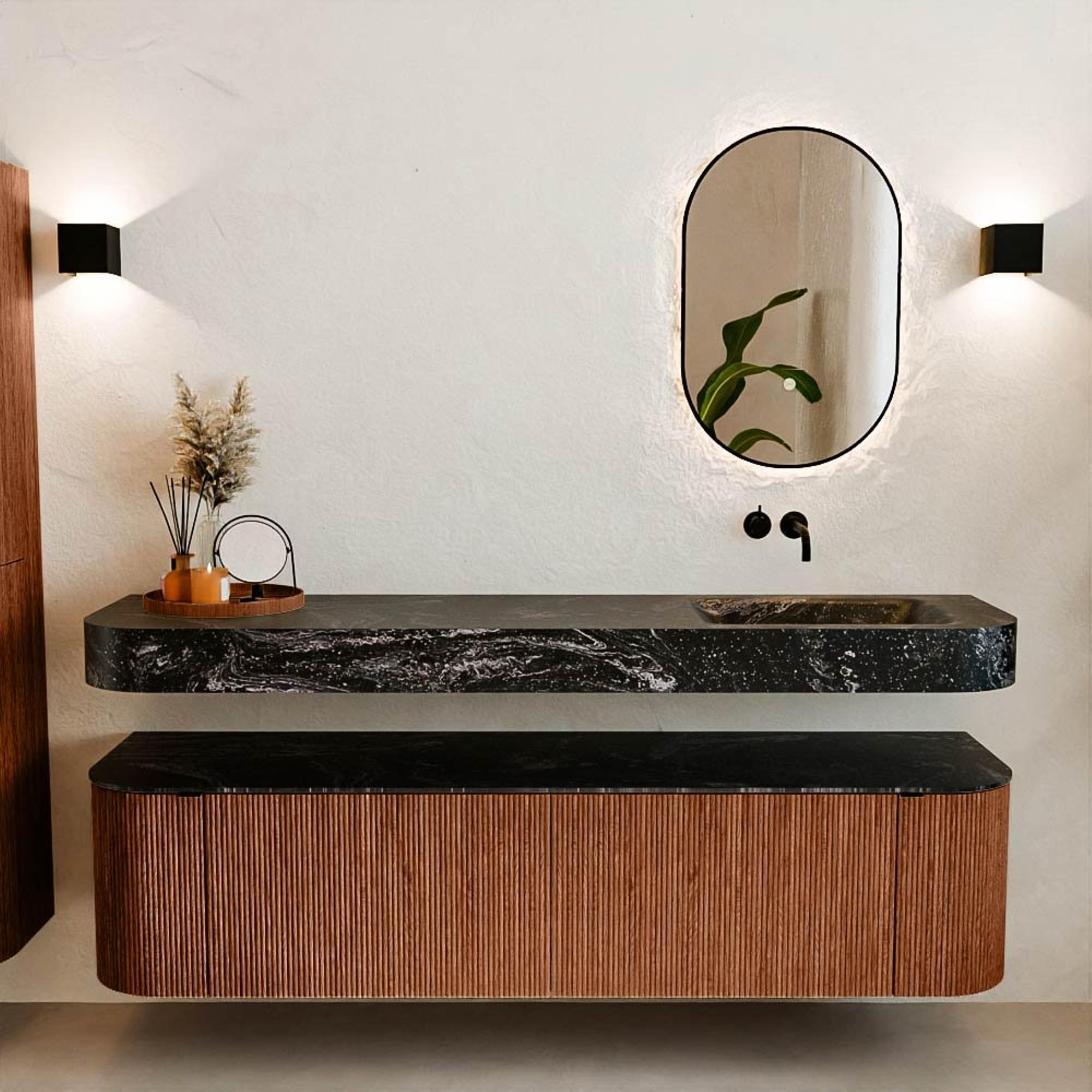 Matériaux naturels aux teintes chaudes. Les rainures verticales apportent rythme et texture au design, tandis que le chêne confère une apparence chaleureuse et artisanale. Choisissez parmi 5 teintes de bois OAK, WALNUT, DUSK, SHADOW et RUBY, des couleurs de bois soigneusement sélectionnées pour enrichir les salles de bains modernes et classiques.