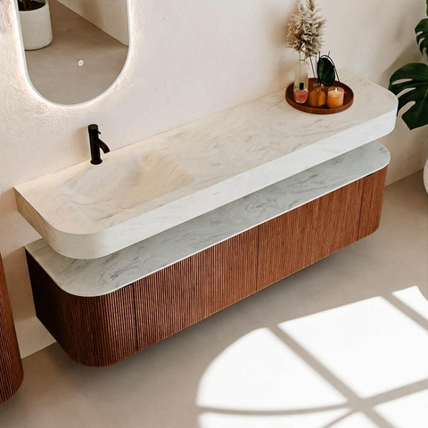 Au-dessus du meuble flotte une vasque suspendue assortie aux coins arrondis – parfaitement adaptée à la forme du meuble. La vasque est réalisée en Solid Surface et suit subtilement les lignes du meuble inférieur, créant ainsi un ensemble harmonieux. Le plan de travail en Solid Surface constitue une base solide et facile d'entretien et complète la combinaison.