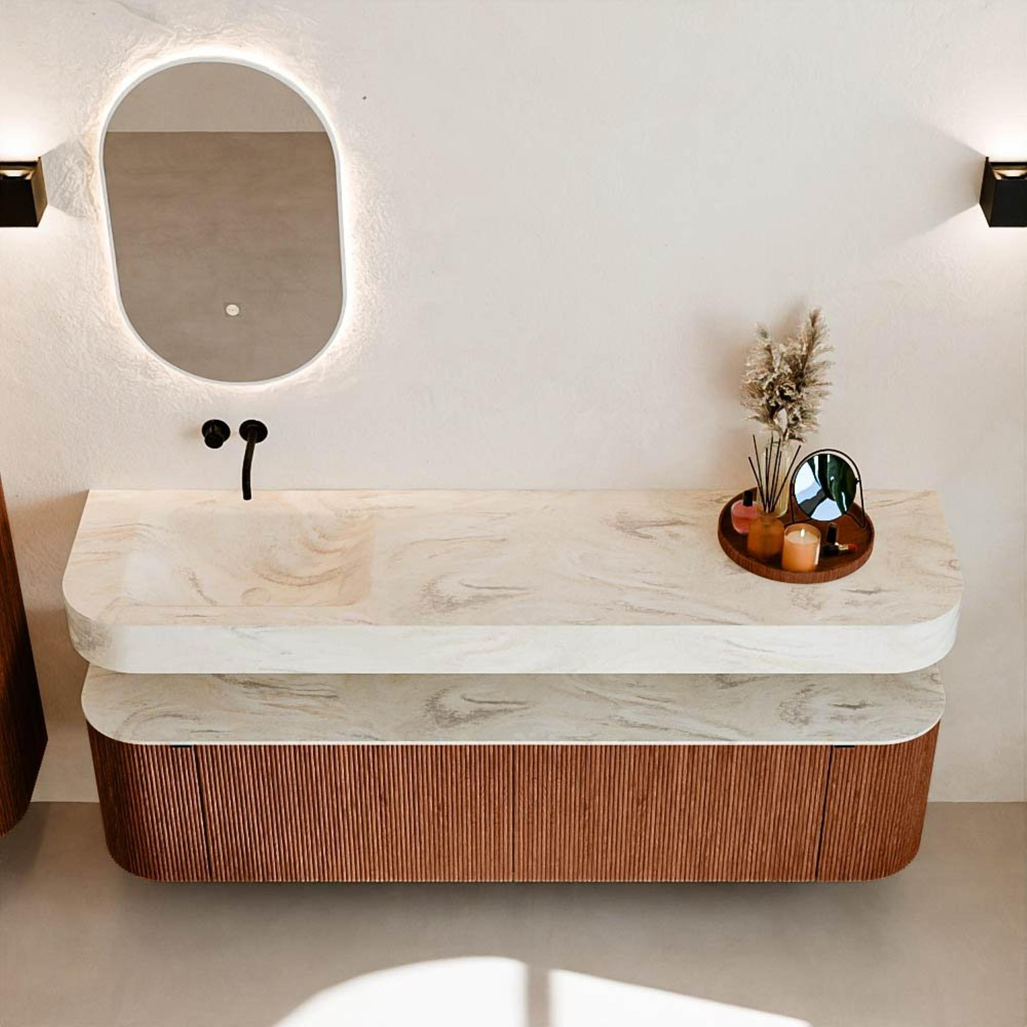 Au-dessus du meuble flotte une vasque suspendue assortie aux coins arrondis – parfaitement adaptée à la forme du meuble. La vasque est réalisée en Solid Surface et suit subtilement les lignes du meuble inférieur, créant ainsi un ensemble harmonieux. Le plan de travail en Solid Surface forme une base solide, facile d'entretien et complète la combinaison.