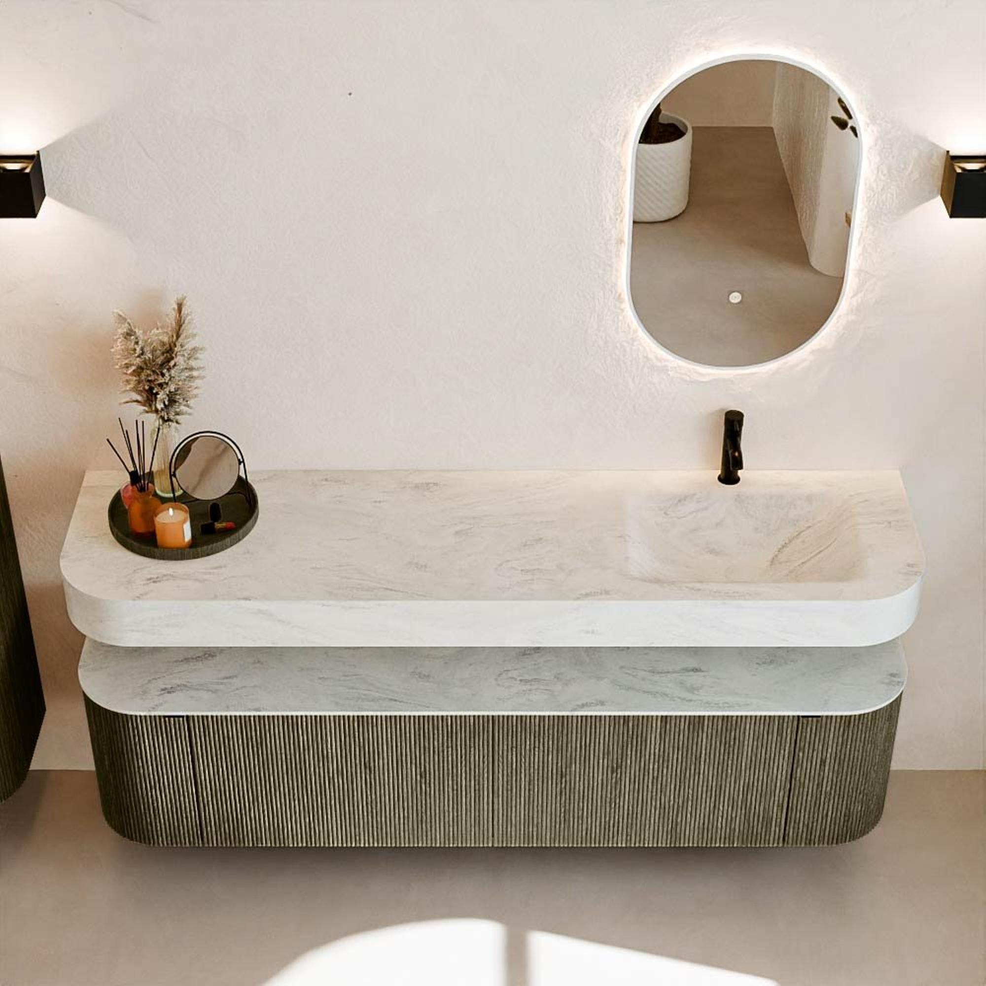 Matériaux naturels dans des tons chauds. Les cannelures verticales apportent rythme et texture au design, tandis que le chêne confère une apparence chaleureuse et artisanale. Choisissez parmi 5 teintes de bois OAK, WALNUT, DUSK, SHADOW et RUBY, des couleurs de bois soigneusement sélectionnées pour enrichir les salles de bains modernes et classiques.