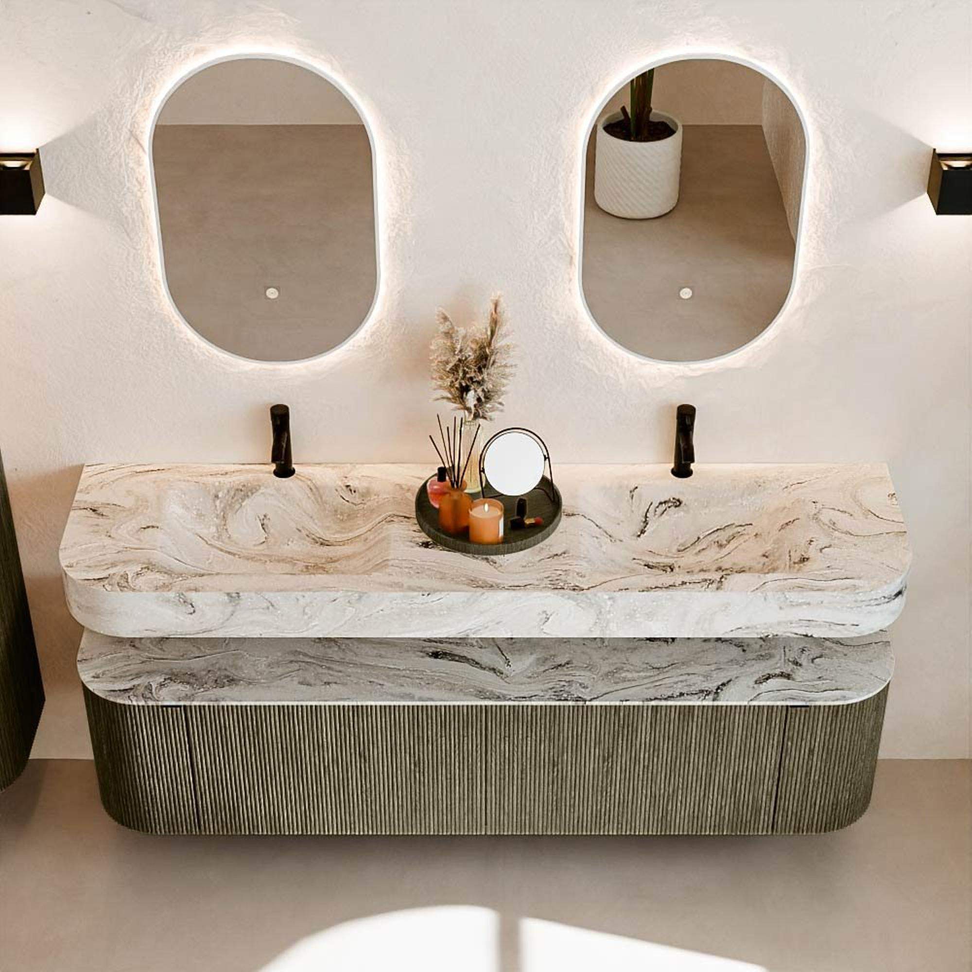 Matériaux naturels dans des tons chauds. Les nervures verticales apportent rythme et texture au design, tandis que le chêne confère une apparence chaleureuse et artisanale. Choisissez parmi 5 teintes de bois OAK, WALNUT, DUSK, SHADOW et RUBY, des couleurs de bois soigneusement sélectionnées pour enrichir les salles de bains modernes et classiques.