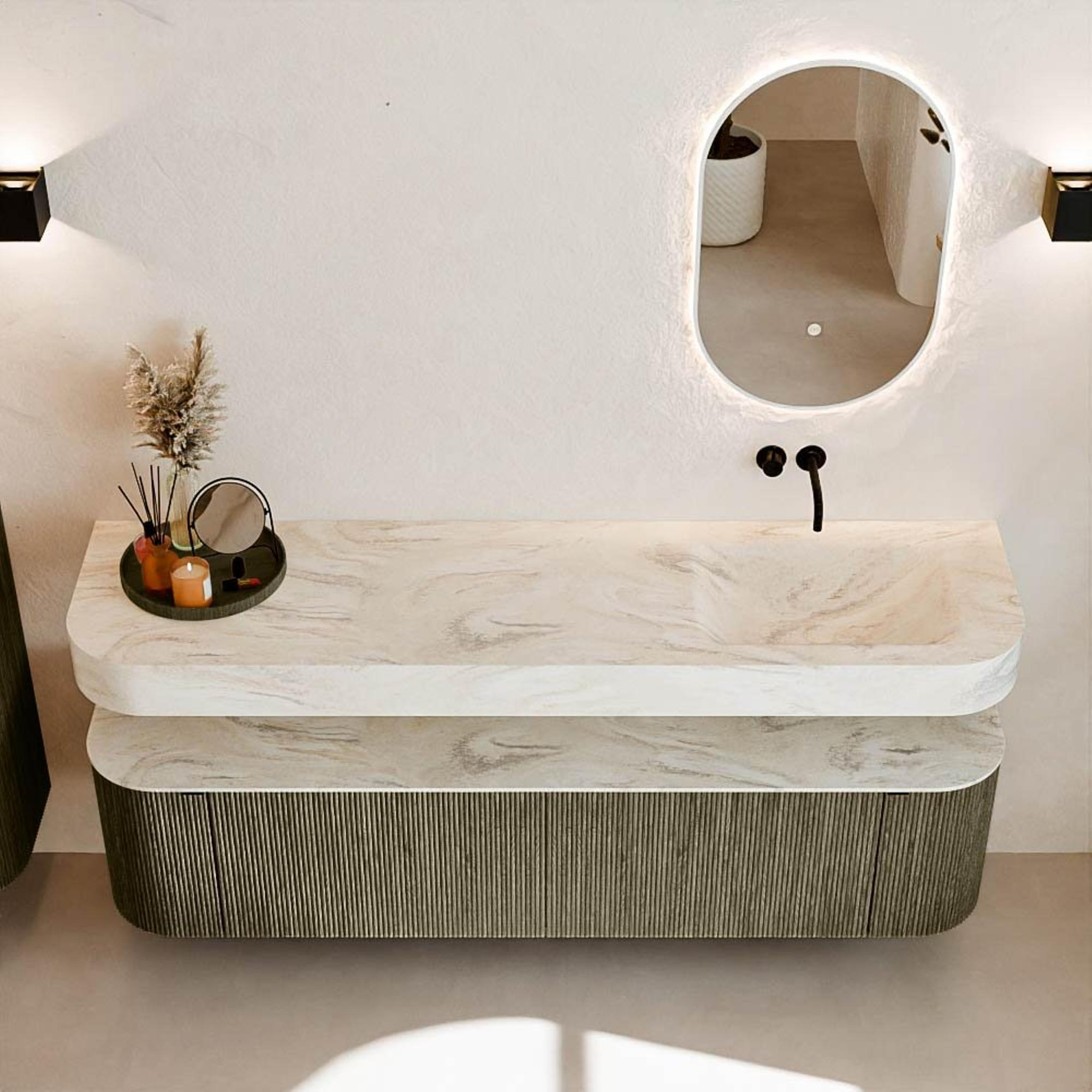 Au-dessus du meuble flotte une vasque suspendue assortie aux coins arrondis – parfaitement adaptée à la forme du meuble. La vasque est réalisée en Solid Surface et suit subtilement les lignes du meuble inférieur, créant ainsi un ensemble harmonieux. Le plan de travail en Solid Surface forme une base solide, facile d'entretien et complète la combinaison.