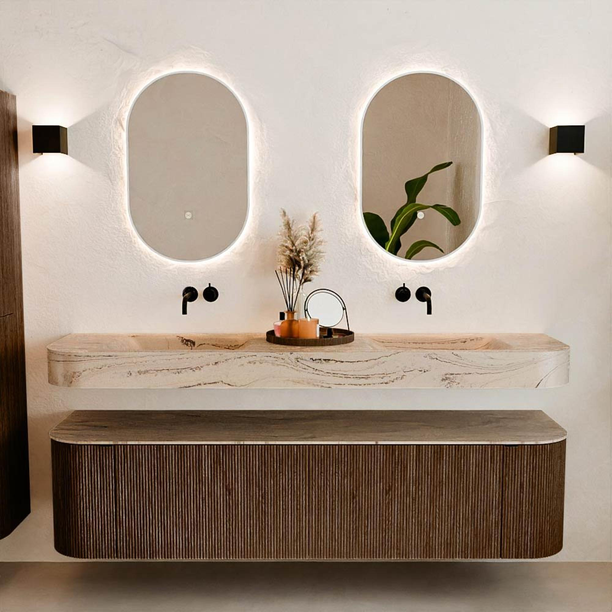 MONDIAZ THOR-DLUX 180cm meuble de salle de bains arrondi gauche + droite couleur Walnut avec 2 tiroirs et 2 portes. Vasque suspendue CLOUD Double sans trou de robinet couleur Arena.
