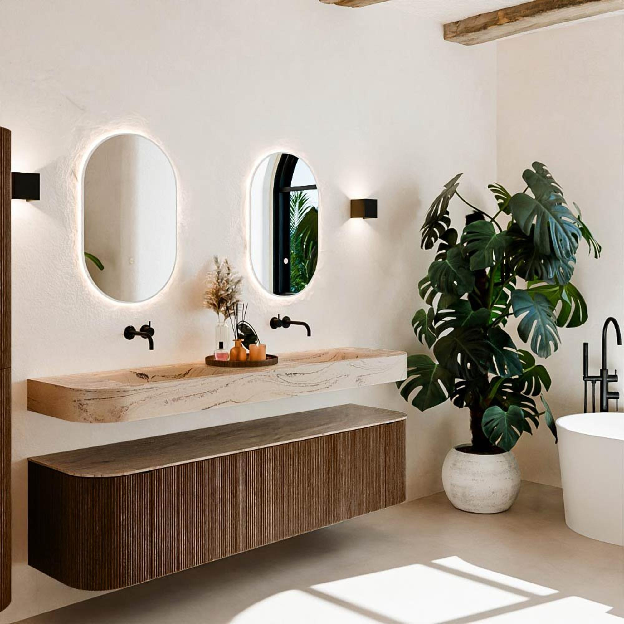 Matériaux naturels aux teintes chaudes. Les reliefs verticaux apportent rythme et texture au design, tandis que le chêne confère une apparence chaleureuse et artisanale. Choisissez parmi 5 teintes de bois OAK, WALNUT, DUSK, SHADOW et RUBY, des couleurs de bois soigneusement sélectionnées pour enrichir les salles de bains modernes et classiques.
