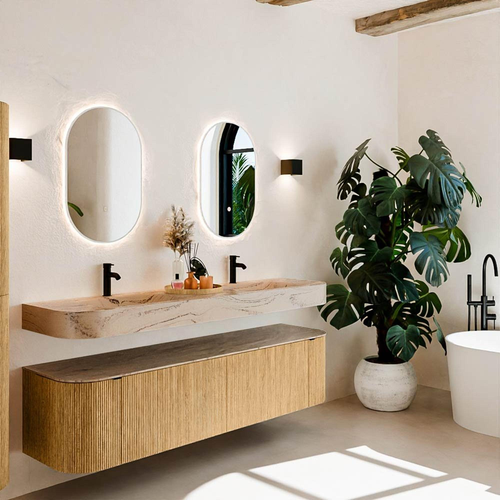 MONDIAZ THOR-DLUX Meuble de salle de bains - 180cm - arrondi gauche + droite - couleur Oak - 2 tiroirs et 2 portes - Lavabo suspendu CLOUD Double 2 trous de robinet - couleur Arena