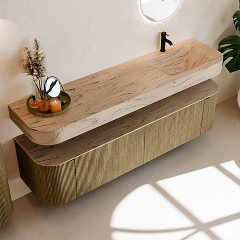 Matériaux naturels dans des tons chauds. Les rainures verticales apportent rythme et texture au design, tandis que le chêne confère une apparence chaleureuse et artisanale. Choisissez parmi 5 teintes de bois OAK, WALNUT, DUSK, SHADOW et RUBY, des couleurs de bois soigneusement sélectionnées pour enrichir les salles de bains modernes et classiques.