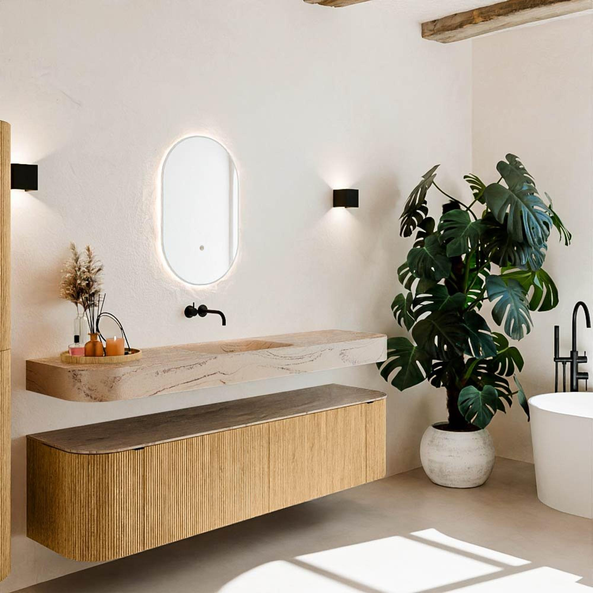 MONDIAZ THOR-DLUX 180cm meuble de salle de bains arrondi gauche + droite couleur Chêne avec 2 tiroirs et 2 portes. Vasque suspendue CLOUD Milieu sans trou de robinet couleur Arena.