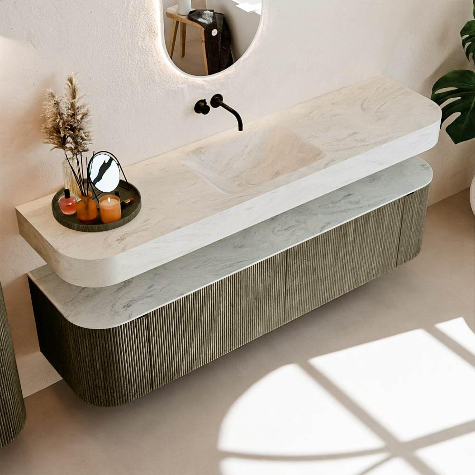 Au-dessus du meuble flotte une vasque suspendue assortie aux coins arrondis – parfaitement adaptée à la forme du meuble. La vasque est réalisée en Solid Surface et suit subtilement les lignes du meuble inférieur, créant ainsi un ensemble harmonieux. Le plan de travail en Solid Surface constitue une base solide et facile d'entretien et complète la combinaison.
