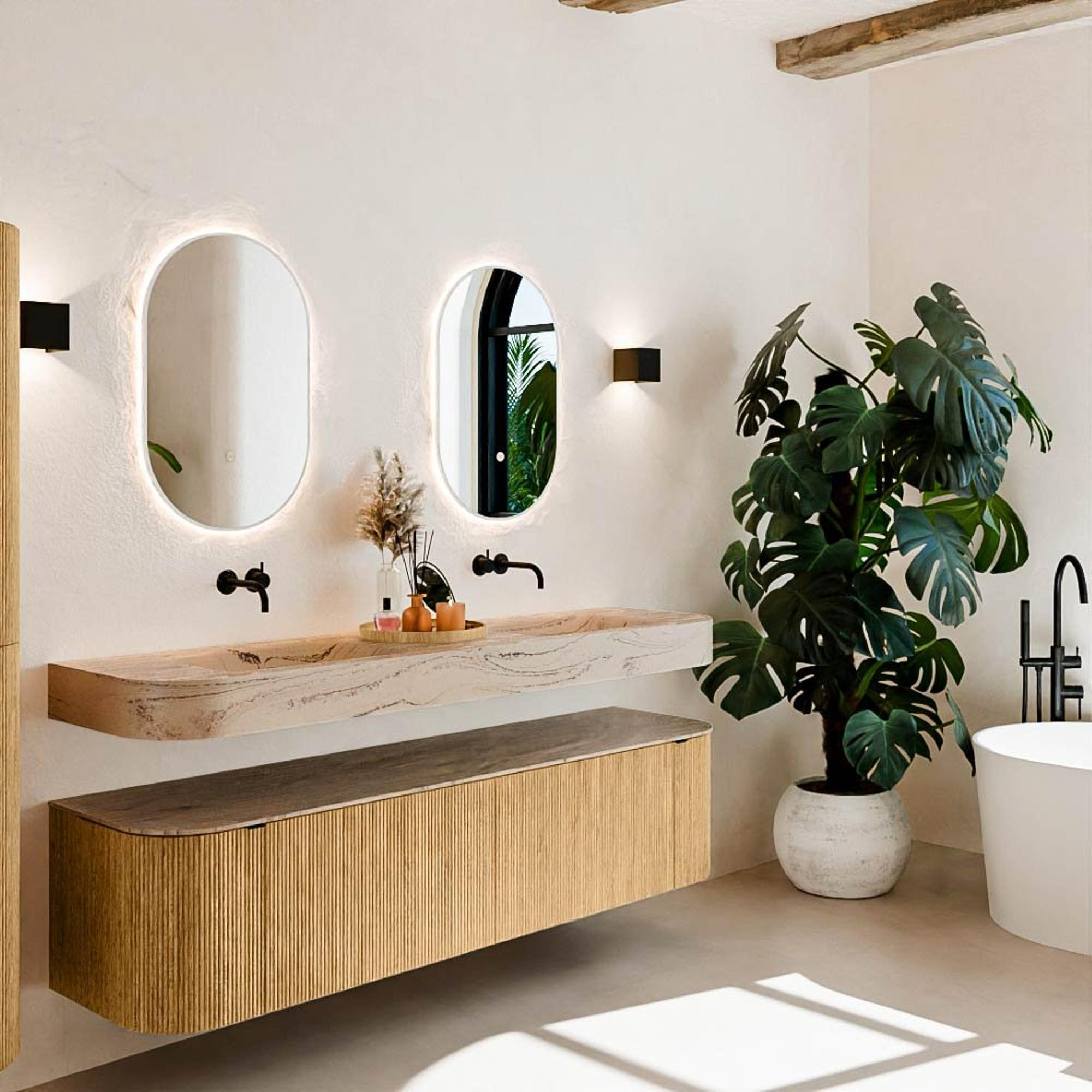 MONDIAZ THOR-DLUX 180cm meuble de salle de bains arrondi gauche + droite couleur Oak avec 2 tiroirs et 2 portes. Vasque suspendue CLOUD Double sans trou de robinet couleur Arena.
