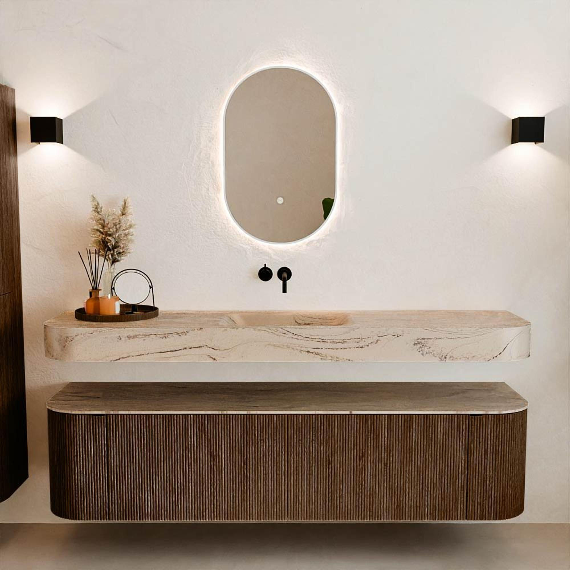Matériaux naturels dans des tons chauds. Les cannelures verticales apportent rythme et texture au design, tandis que le chêne confère une apparence chaleureuse et artisanale. Choisissez parmi 5 teintes de bois OAK, WALNUT, DUSK, SHADOW et RUBY, des couleurs de bois soigneusement sélectionnées pour enrichir les salles de bains modernes et classiques.