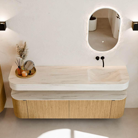 MONDIAZ THOR-DLUX 180cm meuble de salle de bains arrondi gauche + droite couleur Oak avec 2 tiroirs et 2 portes. Vasque suspendue CLOUD droite sans trou de robinet couleur Meli.